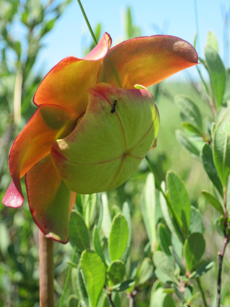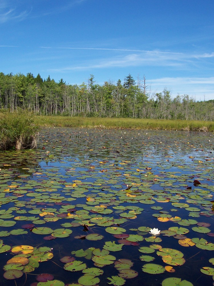 Returning to the trail, you eventually make your way to the place where plants eat insects, moose wallow in the muddy waters, and minks scurry about looking for fish: the Holt Pond Overlook. The Holt Pond Overlook boardwalk crosses over a quaking mat of sphagnum moss. If you bend your knees twice, you will see a slight quaking motion at the end of the boardwalk. This is because the sphagnum moss is floating, colonizing the open water in front of you. The quaking bog is home to pitcher plants, orchids, leatherleaf, swamp rose, and many other unique plants, as it is one of the most diverse natural communities at Holt Pond. Pause at the end of the boardwalk and appreciate the beauty of this spot in every season, when migrant ducks swim about, water lilies dot the surface, reflected red, yellow, orange, and brown leaves shine in the depths, or snow and ice insulate the vibrant life underneath.