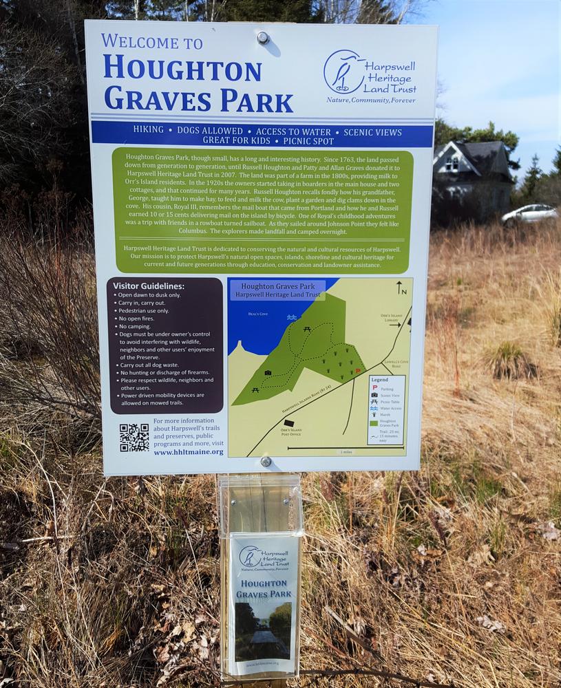 Given to the Harpswell Heritage Land Trust by Russell Houghton and Patty and Allan Graves in 2007, this park will forever be available for the enjoyment of both residents and visitors.