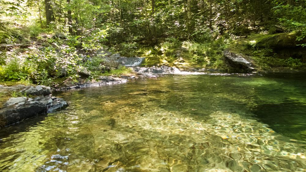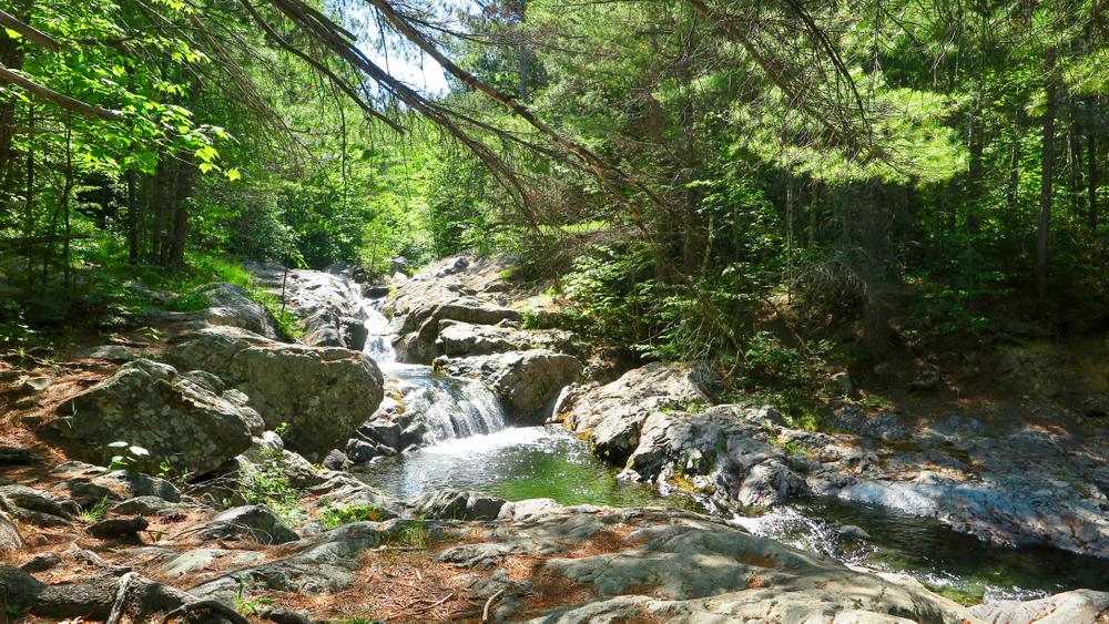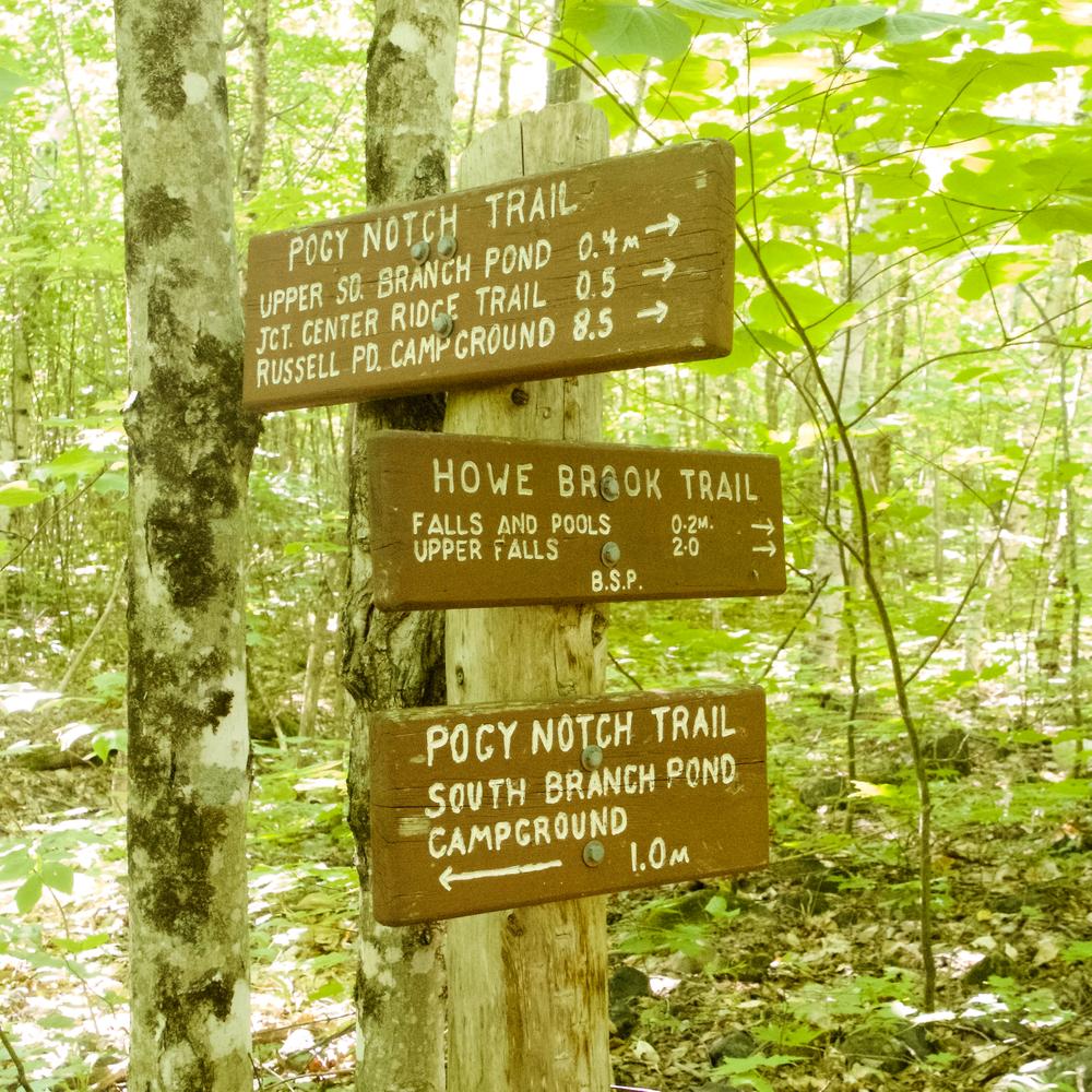 The trail begins on the Pogy Notch Trail, starting at the east end of South Branch Pond Campground. The trail follows along the shore of South Branch Pond for 1 mile before reaching the junction with the Howe Brook Trail, to the left. The Howe Brook Trail parallels the north bank upstream for 0.2 miles, where the first of a series of smooth chutes with deep pools is encountered. There are also a number of well-developed potholes formed by the grinding action of pebbles propelled by circular currents. These provide interesting and invigorating swimming in natural "bathtubs.”