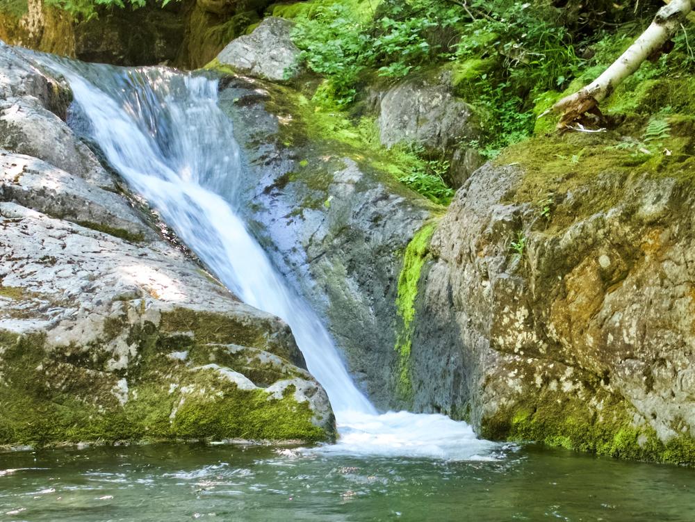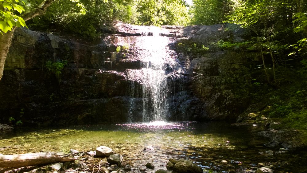 Above this point is a continuous series of falls to 0.5 miles. The trail crosses and re-crosses the brook, then commences a long gradual climb along its banks. At 1.8 miles an unmarked side trail leads right (south) to a set of falls and flumes located in a deep ravine. The main trail climbs steeply away from this ravine (use caution here) but rejoins the brook above the ravine. At 2.0 miles the trail ends at the base of a 20 foot sheer waterfall with a small pool at its foot. This is a good picnic spot.