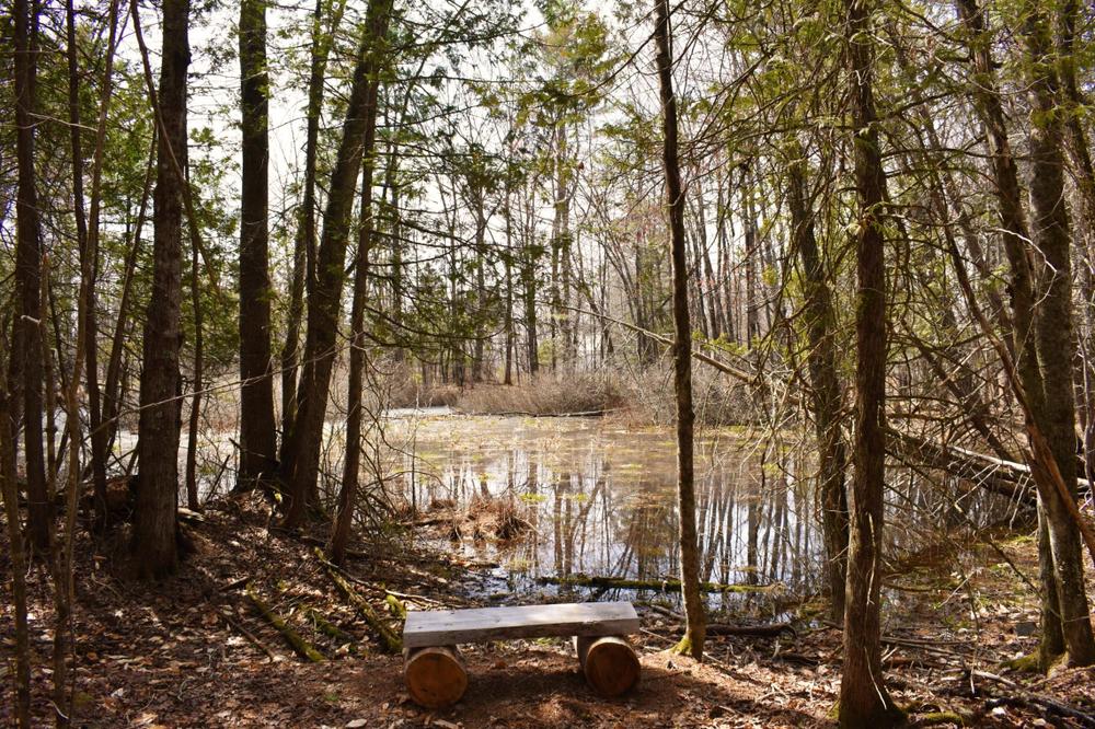 The Pines Loop (blue blazes) passes through the pine plantation, making use of long-established woods trails. Two benches offer peaceful resting spots at the frog pond.