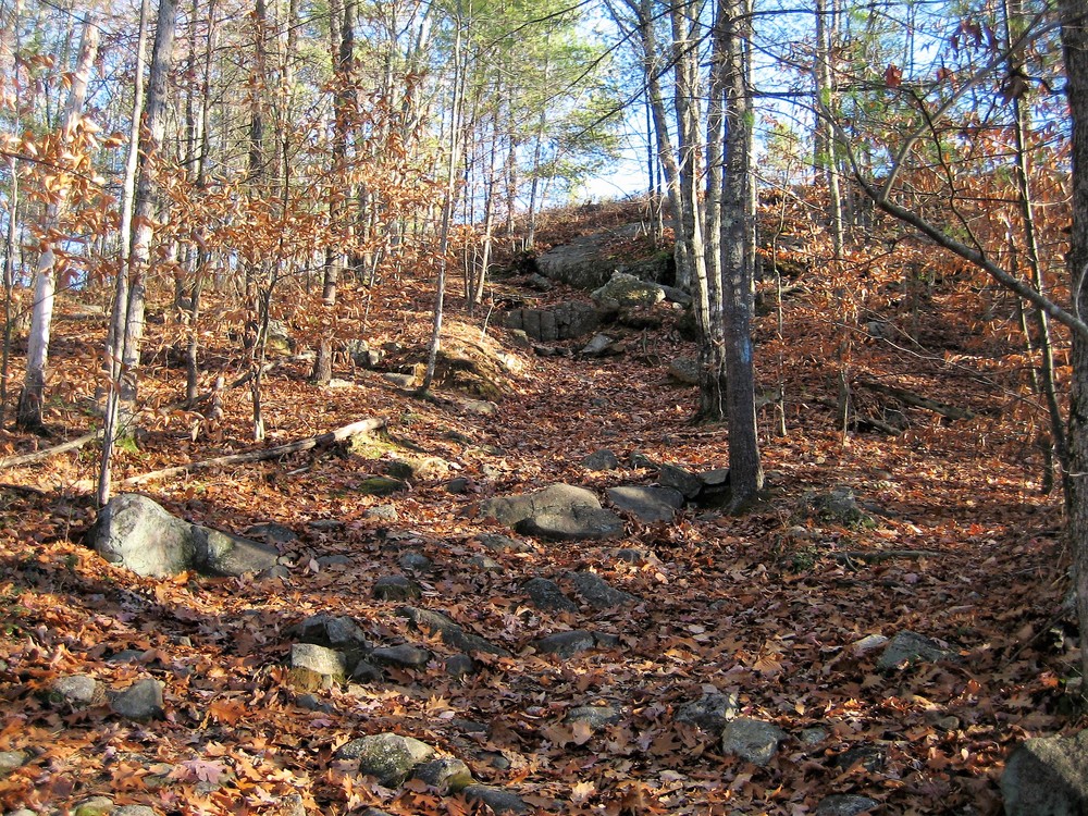 The Jockey Cap trail starts directly off the NW corner of the parking lot, at the wooden arbor with "Jockey Cap Trail" written across the top. The trail follows rolling terrain to the west for approximately 800 feet, leading to a forested boulder field at the base of Jockey Cap Rock. Small caves and excellent bouldering may be found here. Continuing past this boulder field the trail winds around Jockey Cap and climbs steeply for 0.1 miles before breaking free of tree cover and ascending to the apex of the rock.