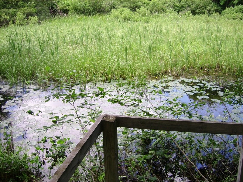 Geology Trail (blue, 0.6 miles): The most rigorous hike in the sanctuary, the extremely varied and steep Geology Trail begins in the meadow just north of the cellar hole, winds through coniferous woods to Robinhood Cove, parallels the eastern shore of the cattail marsh, and returns to the meadow.