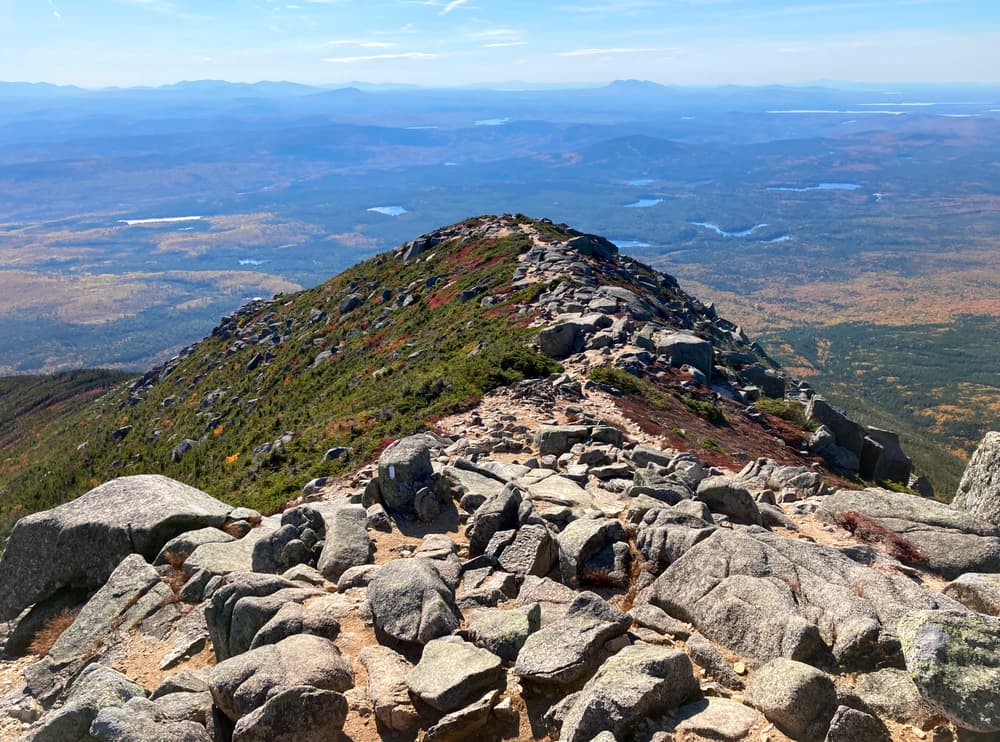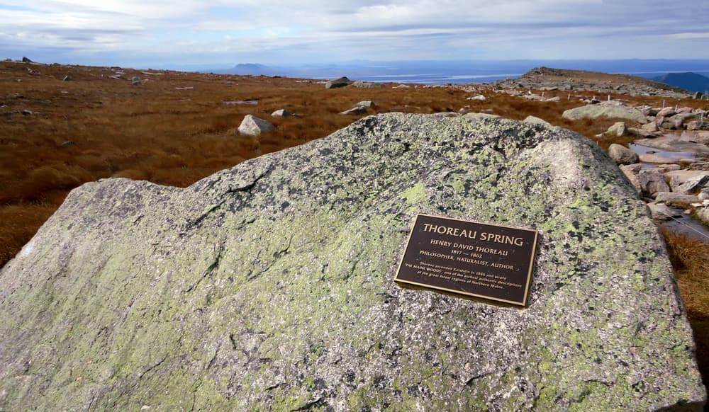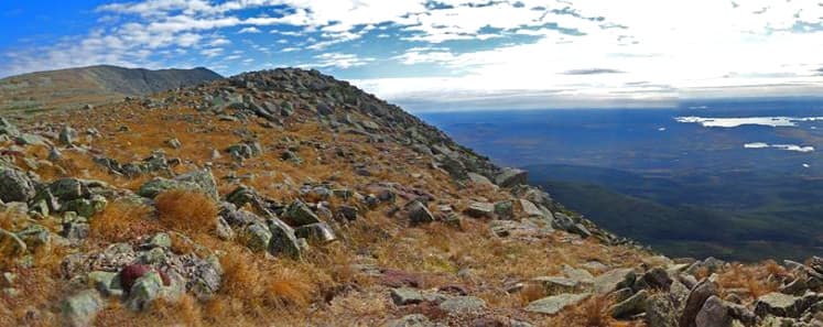 The Abol Trail (2.6 miles, 3,365 feet elevation gain) is the shortest route to Baxter Peak from a road, but has almost the same elevation gain as other trails to the peak. The trail formerly utilized the prominent Abol Slide that came down in 1816. The upper portion of the slide re-slid again in 2014, destabilizing an already hazardous route, so in 2015 the trail was relocated to the ridge to the west of the slide. Above the slide, the trail uses the original rock scramble route to reach the Tableland and cross on level ground to Thoreau Spring (not a recommended water source, as it is shallow and hikers walk through it), the end of the Abol Trail and its junction with the Hunt Trail. It is another mile and an additional 617 feet of elevation gain along the Hunt Trail from this junction to Baxter Peak (elevation 5,267 feet), the tallest peak of Katahdin.
