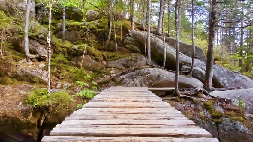The Hunt Trail (4.5 miles, 4,188 feet elevation gain) is one of the more popular trails to the summit of Katahdin. It includes outstanding features along the way such as the picturesque Katahdin Stream Falls, the Boulders on Hunt Spur, the traverse of the Tableland, and extensive views along the final 2.4 miles of the trail above tree line. The trail was originally cut in the 1890s by sporting camp owner Irving Hunt, then partially relocated to its present route in 1934 by the Civilian Conservation Corps. This is a strenous 8-9 hour hike; Katahdin Stream Falls, located just 1.1 mile up the Hunt Trail, is a great shorter alternative. The 80-foot high waterfall is located in a deep mossy ravine, and is one of the best in the Park. The Hunt Trail coincides with the most northern stretch of the Appalachian Trail.