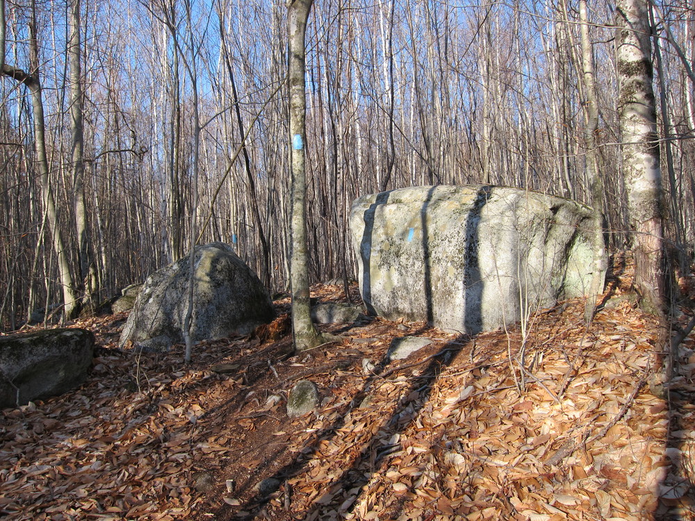 The trail, marked with blue blazes, leaves from the north side of the parking area, winding westerly and briefly paralleling an old logging road. At 0.2 miles there are nice views from the south end of Watson Pond from atop a large boulder. The trail crosses the inflow for Watson Pond, briefly follows what was a logging road, then, after veering to the left, narrows and begins climbing moderately to the west. The trail eventually turns right (north) after crossing a short, wet area and follows the ridgeline through a rock field where there are views to the east of Watson Pond, Mount Phillip, and French Mountain. The trail cuts directly through and over some large granite slabs at 0.9 miles and continues on to a sparsely wooded summit area with views to the east and south through the trees at 1.1 miles.