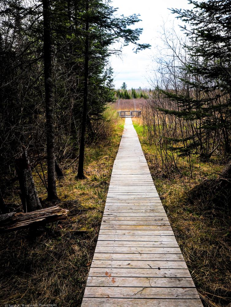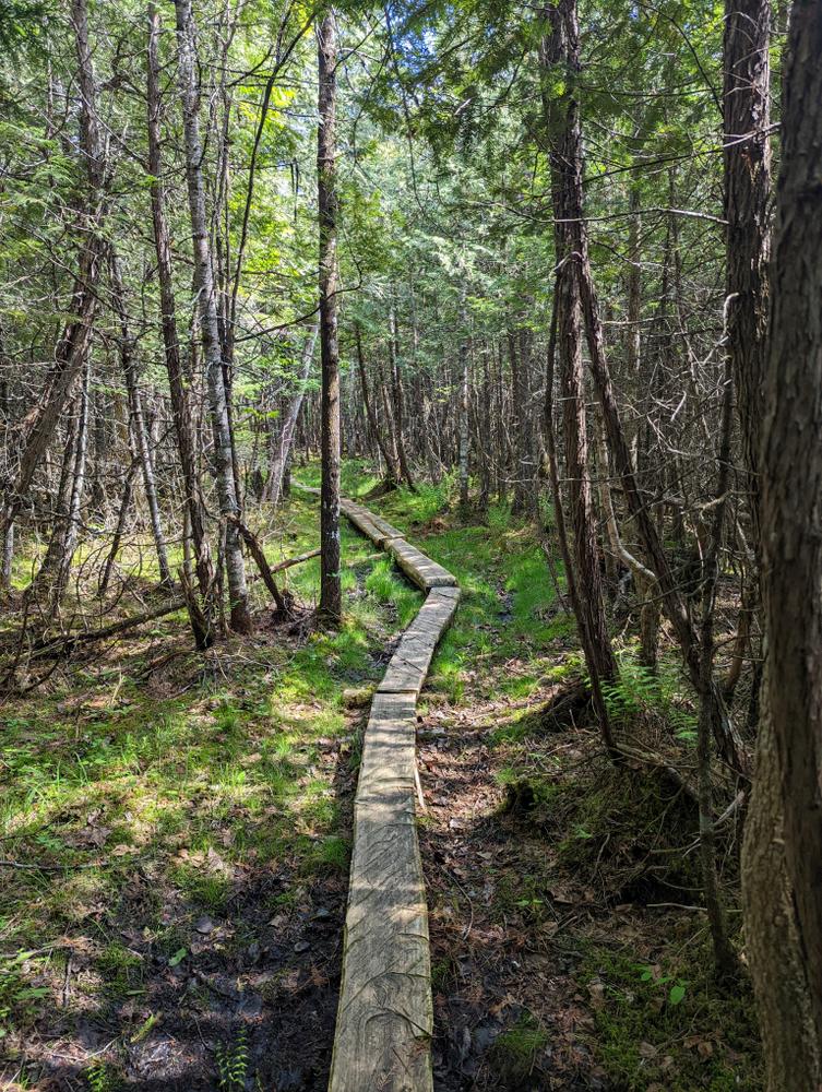The Law Farm Loop Trail is a self-guided interpretive trail, just over a mile long. Starting at the trailhead by the parking lot, the trail passes the Children's Garden and joins the Bog Walk Trail, which connects to a boardwalk overlooking a northern white cedar wetland. This area offers a peaceful spot to enjoy wildlife on the observation deck.