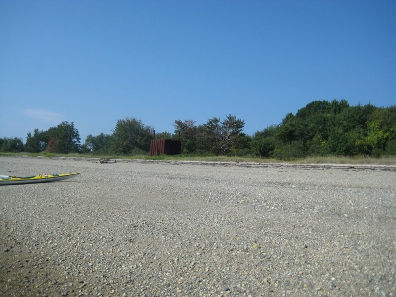 The east beach facing Chandler Cove provides the best landing and anchoring ground for boaters looking to access the trail network on Little Chebeague. This beach is a popular destination for day users and offers unimproved campsites for overnight visitors. The trailhead can be found in the middle of the beach, a few hundred feet north of the metal structure (the remains of a former fire-fighting trainer).