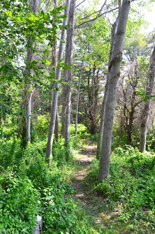 A spur trail leads west from the northwestern corner of the Cottage Loop Path (near a point with water views northward) to a beach on the northwestern shore of the island. Return from the beach via this spur to continue hiking the trails.