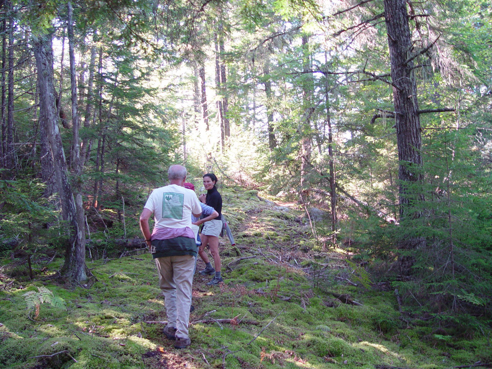 The Little Mayberry Cove Trail runs approximately two and a half miles along the western shoreline of West Grand Lake. The trail begins at the village of Grand Lake Stream and follows moderately rolling terrain through mossy stands of hemlocks and pines, ending at a quiet cove. Hikers can return on the same trail, or loop back via interior logging roads.