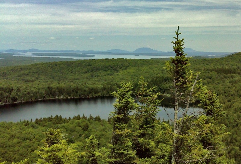 Loop option - For those interested in a shorter overall hike looping around two ponds, the loop trail sweeping past the eastern shore of Big Moose Pond and back around the northern shoreline of Little Moose Pond is approximately 3.8 miles of hiking and returns to the central trailhead for Big and Little Moose Ponds (see above). This loop includes excellent views from the ledges overlooking the two ponds. These vistas provide a sweeping view northward to Big Moose Mountain and beyond to Moosehead Lake, Mount Kineo, and both Little and Big Spencer Mountains. Partial views of other mountains extend in other directions.