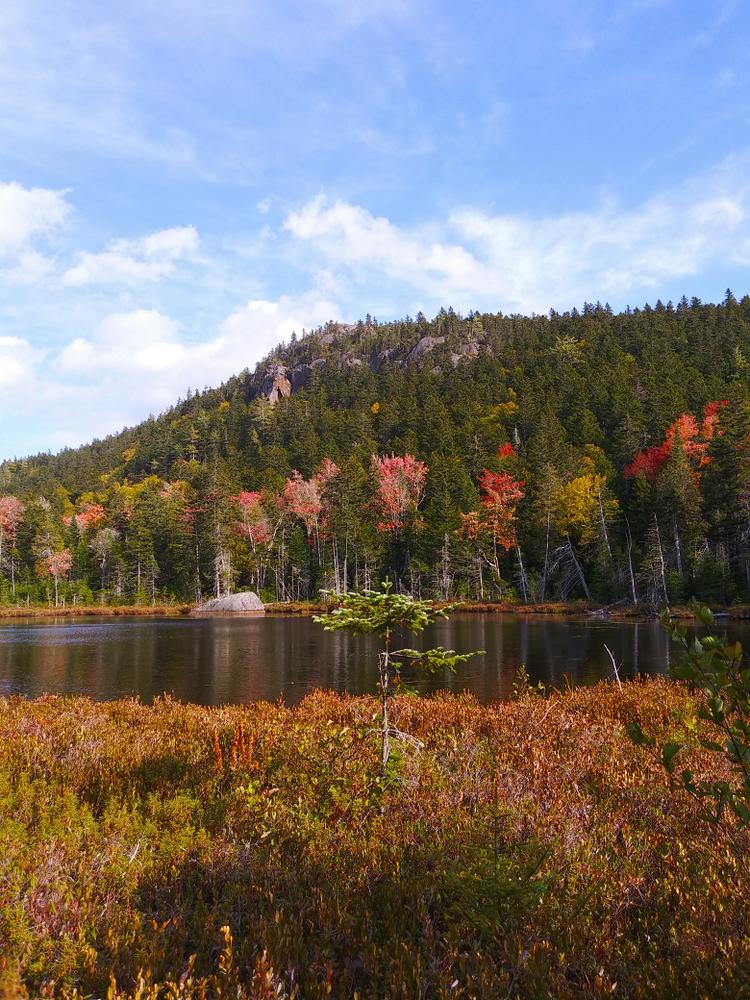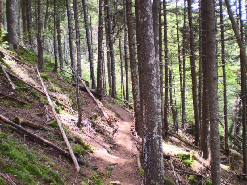 Northern hardwood trees including yellow birch as well as plants and bushes such as clintonia, hobblebush, and bunchberry are encountered along this section. After the ponds, the trail steepens and then provides occasional, filtered views. The trail begins to drop as it heads for the intersection with the loop trail just east of Big Moose Pond. In total, it is approximately a little over or under 3 miles from the trailhead to this intersection, depending on which trailhead is chosen.