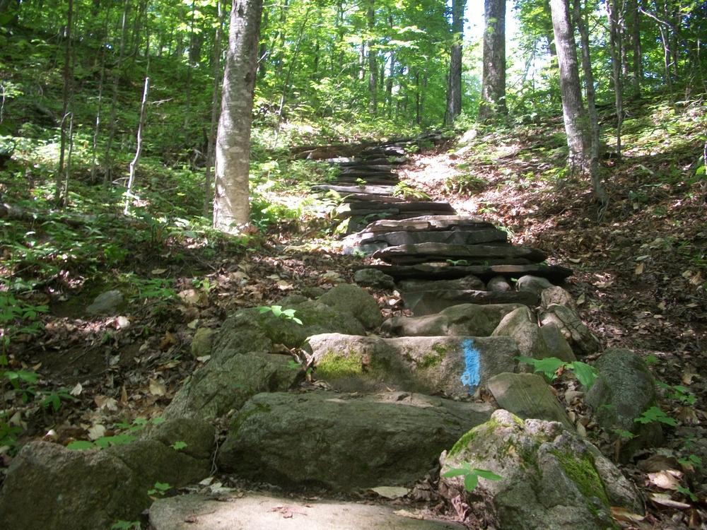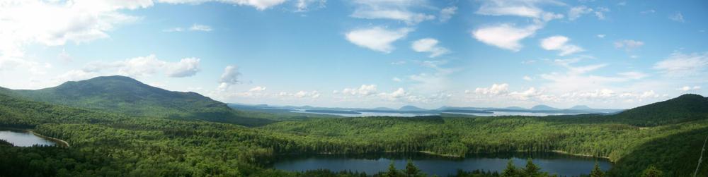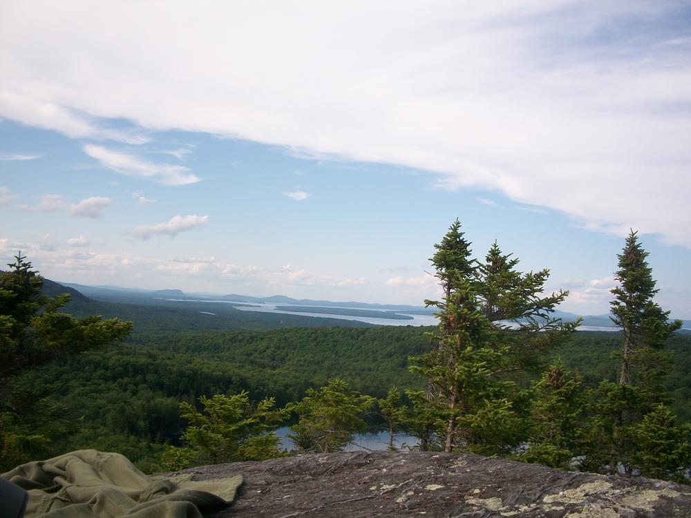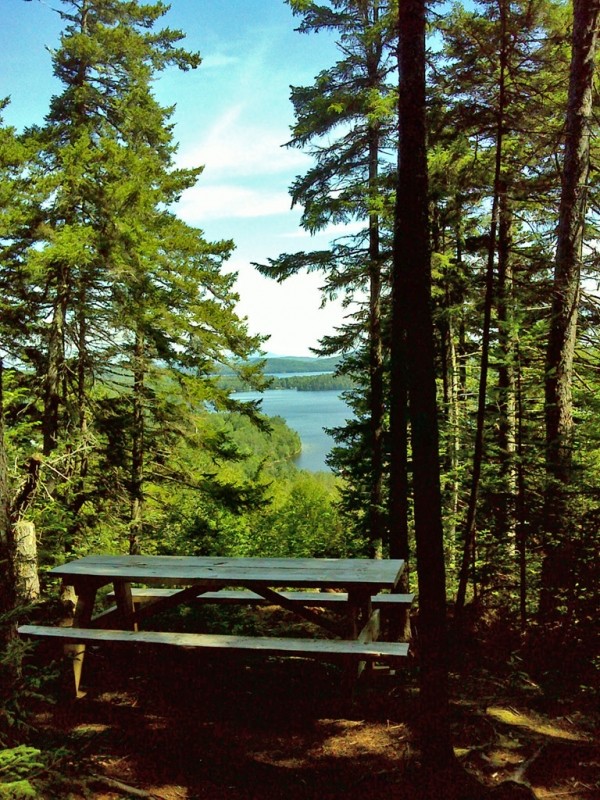 From Moose Mountain Inn (formerly Greenwood Motel) - The hike from this easternmost trailhead immediately begins to rise through mixed woods as it travels towards a series of pleasant viewpoints. Shortly after beginning, the trail crosses an ATV/snowmobile trail. Not long after that point, the first viewpoint presents an open view of the southern tip of Moosehead Lake. A picnic table makes this vista a relatively easy destination for a quick picnic. Further along the trail, periodic views open in a variety of directions. The trail is moderately steep and quite bony (rocky with ledges). Sounds from truck traffic can be heard some through the attractive, predominantly spruce and fir forests of this section.