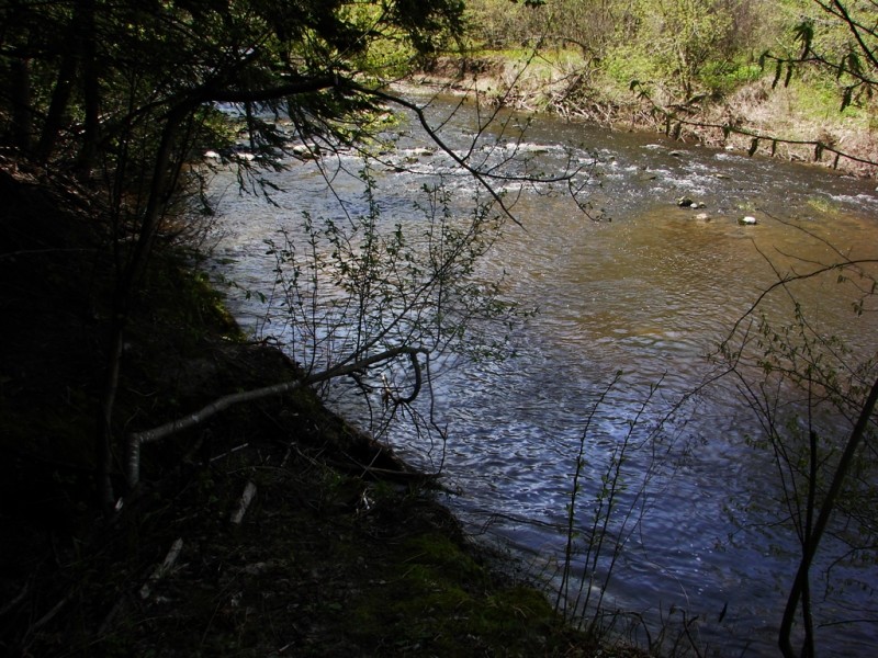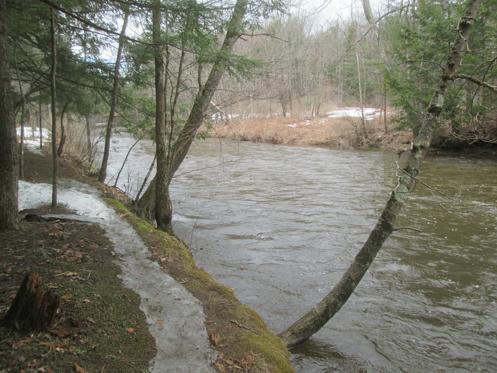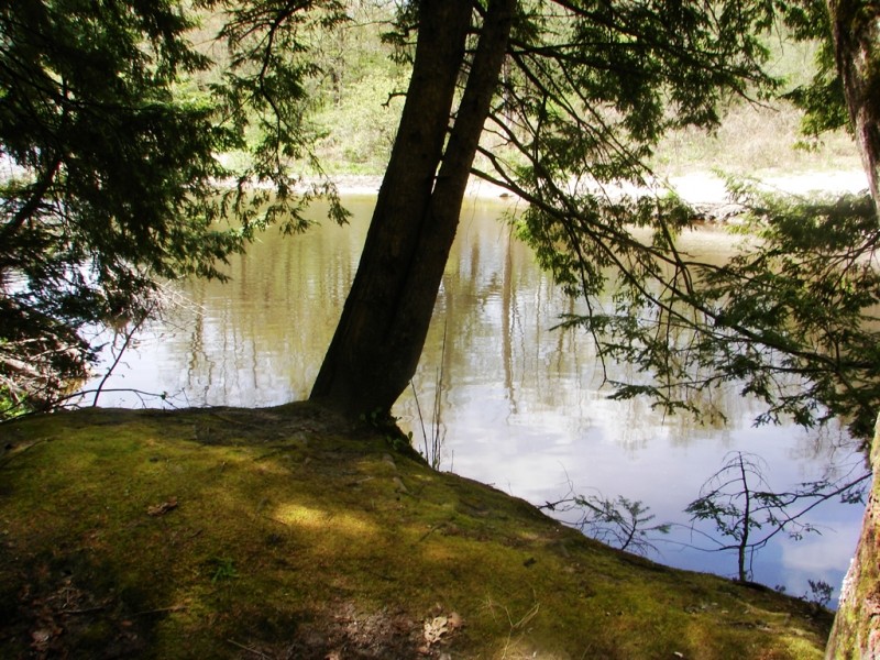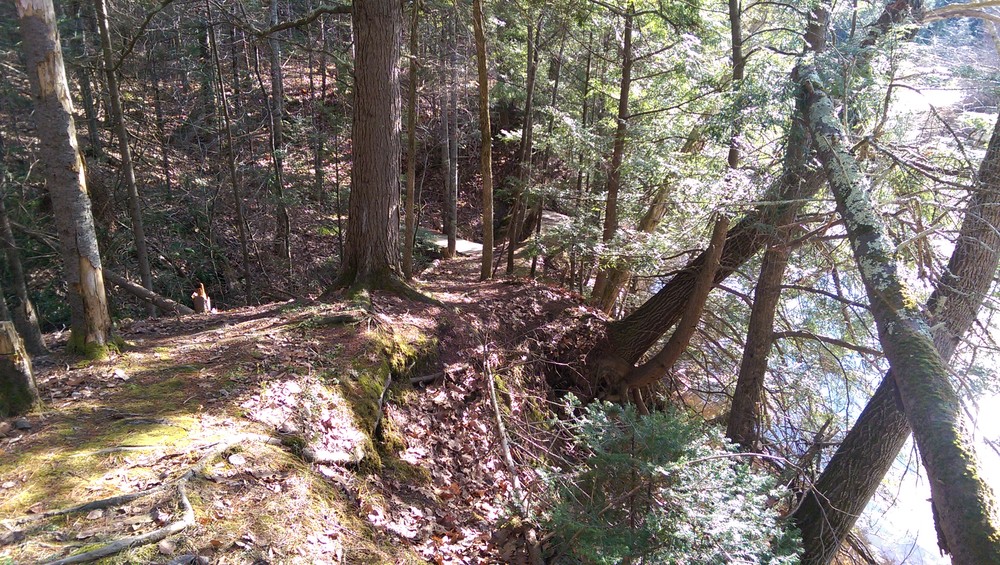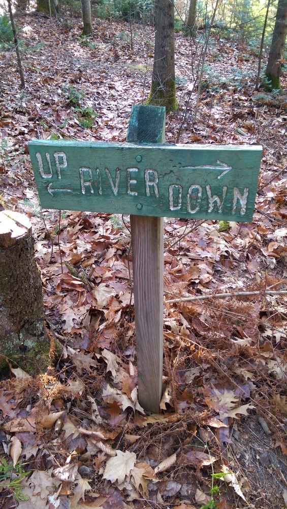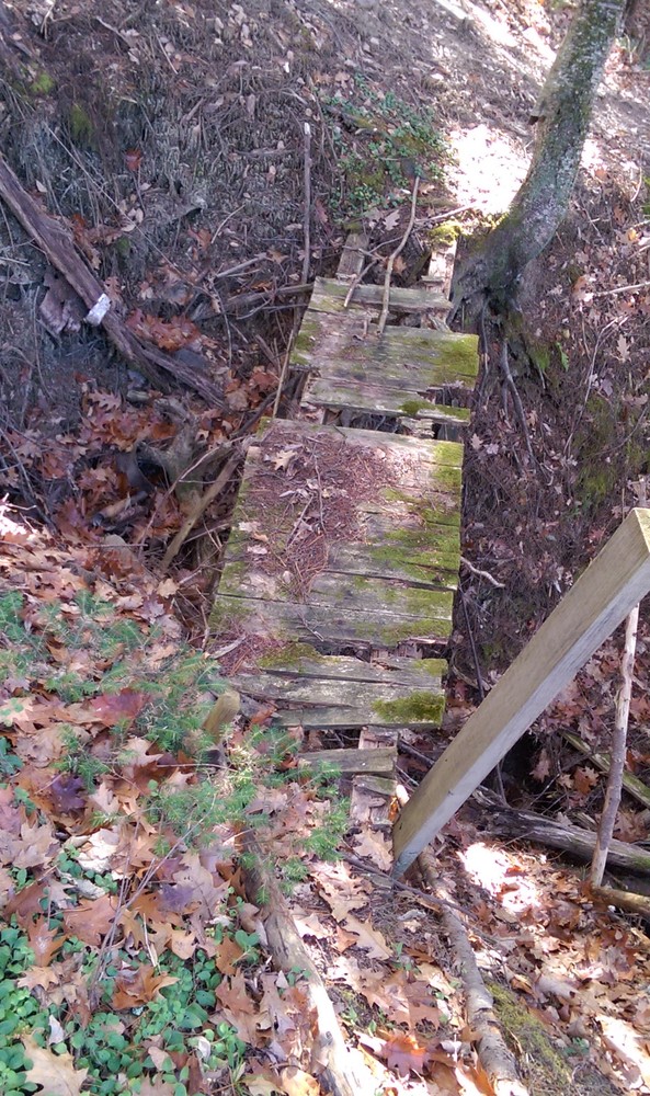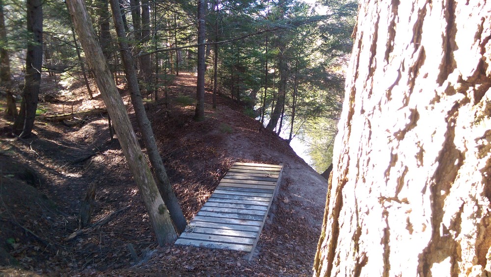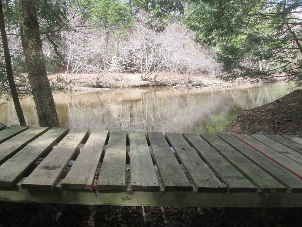 When one follows the River Trail above the sign marked "Up River Down," the hike can become more challenging with steep, uneven earthen stairs leading to narrow bridges which cross the numerous gullies. The rest of the trails offer very gentle grades and woodland tranquility.