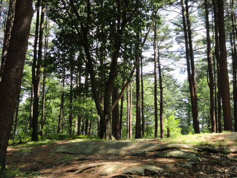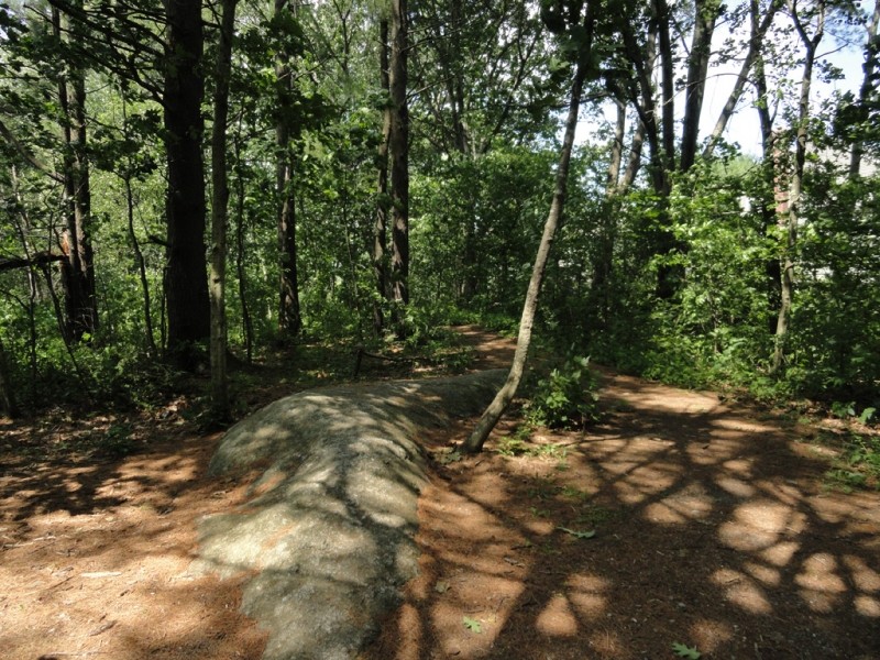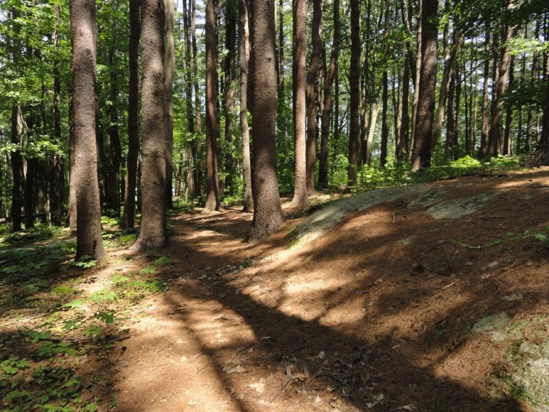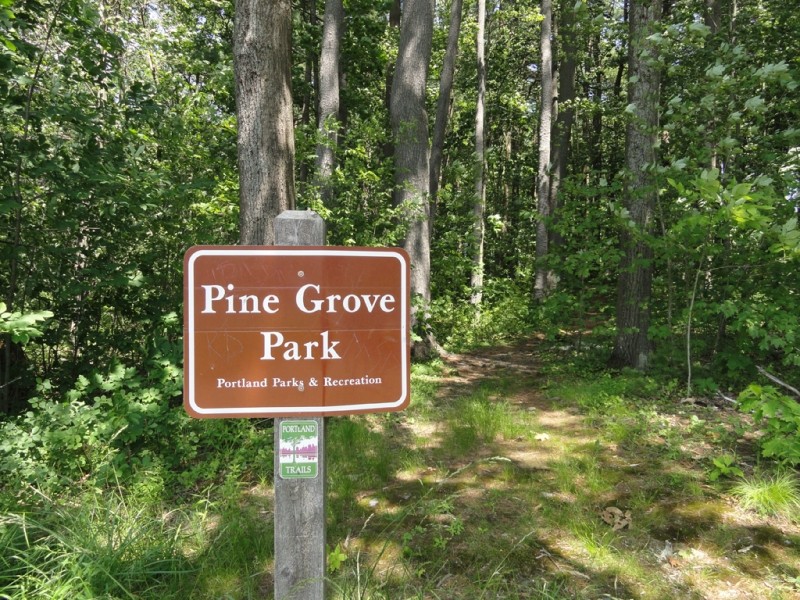 The Lyseth/Moore trailhead starts at the Lyseth playground. The trail is flat as it winds through the wooded terrain of the school yard. The trail then crosses Allen Avenue towards Pine Grove Park before climbing a moderately steep slope in the park. The park features rocky outcroppings and relatively open stands of mainly White Pines.