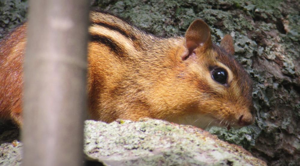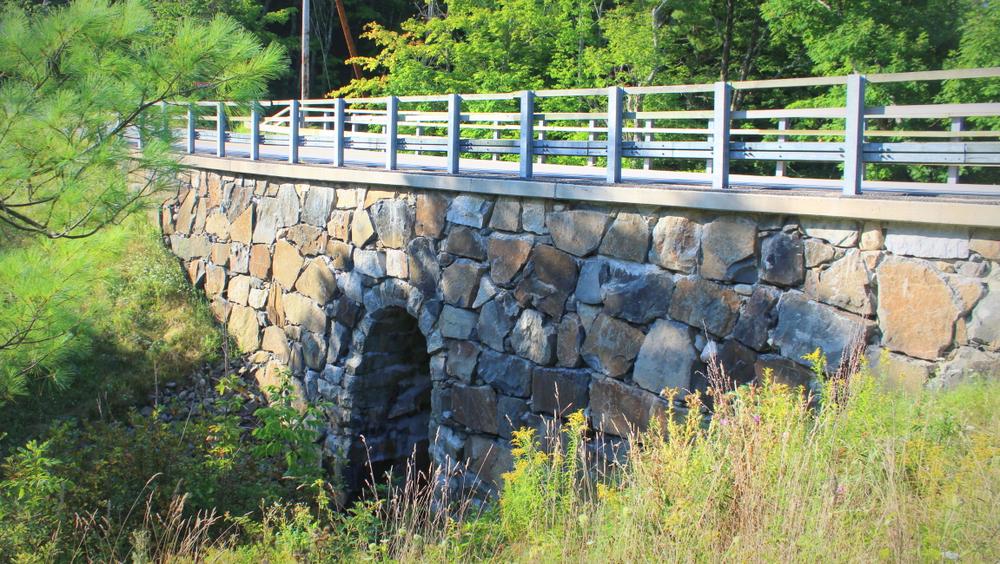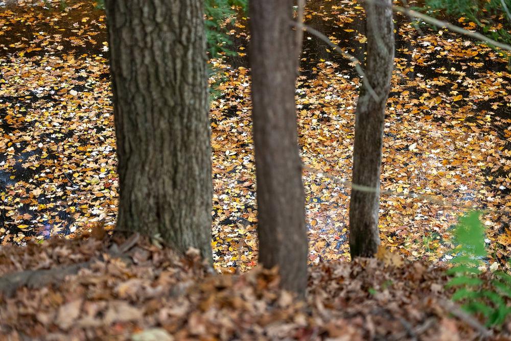 Shortly after the third bridge, the trail takes a sharp left turn, crosses the site of an old stone wall, and follows the edge of the ravine above the stream. The trail along this section has great views of Stackpole Creek, and just before leaving the woods, it passes through a small area with Eastern Ironwood trees, also known as American Hornbeam.