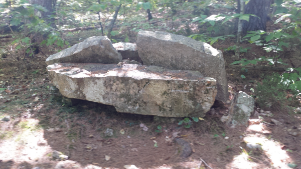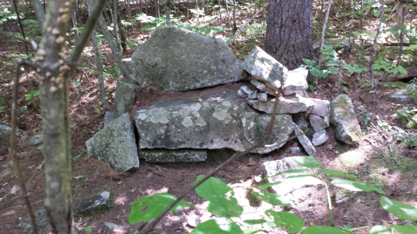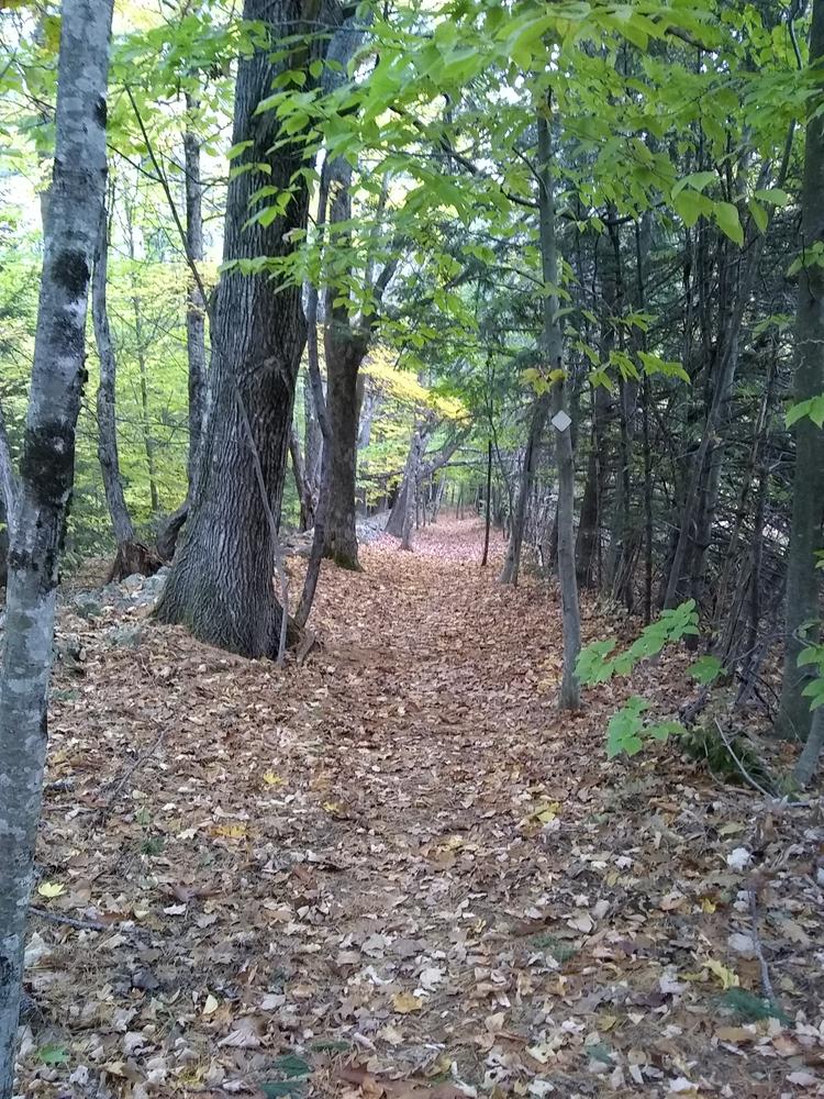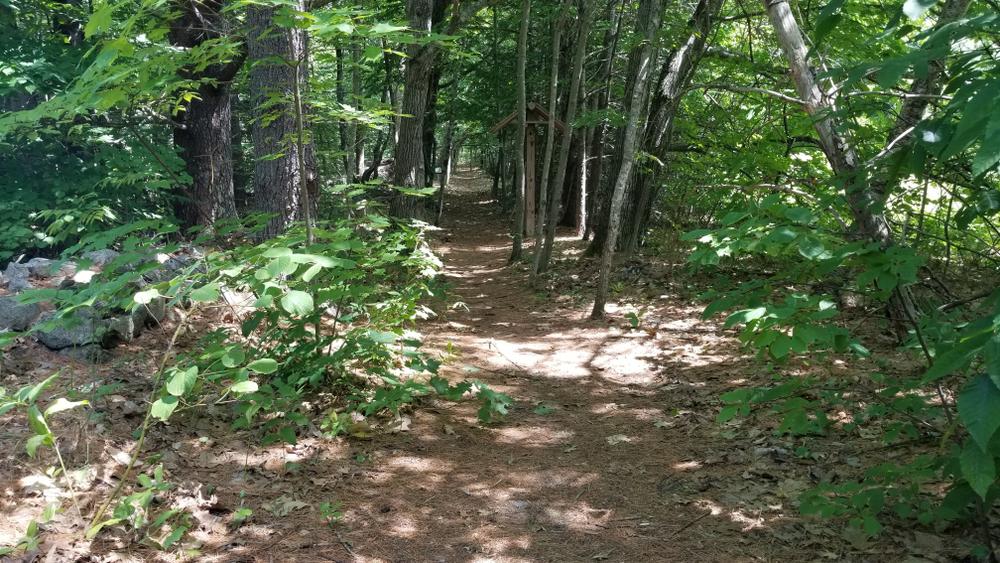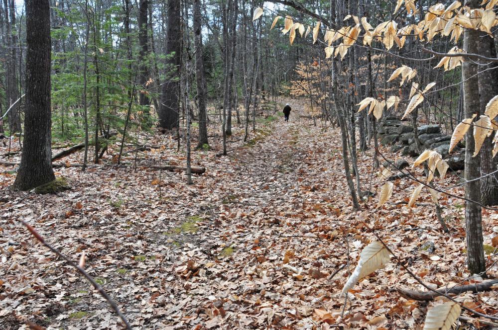 The trail starts at the kiosk, visible from the road. Following the main loop trail clockwise, there is a downhill slope for a third of a mile. Look for history as you walk. Stone walls and barbed wire fences are evidence of agricultural uses in previous centuries. As the trail starts to go downhill more steeply, it passes a rocky outcrop on the left, a former quarry pit where foundation stones were cut from ledge. The second leg of the trail is relatively flat, but with uneven footing over rocks and tree roots. You will see logging trails and other evidence of recent forestry activities. The third leg of the loop also has sections of uneven footing. As you near the end of the loop there are logging trails to the field, where a few apple trees, in the field and adjacent woods, are all that remain of former orchards.