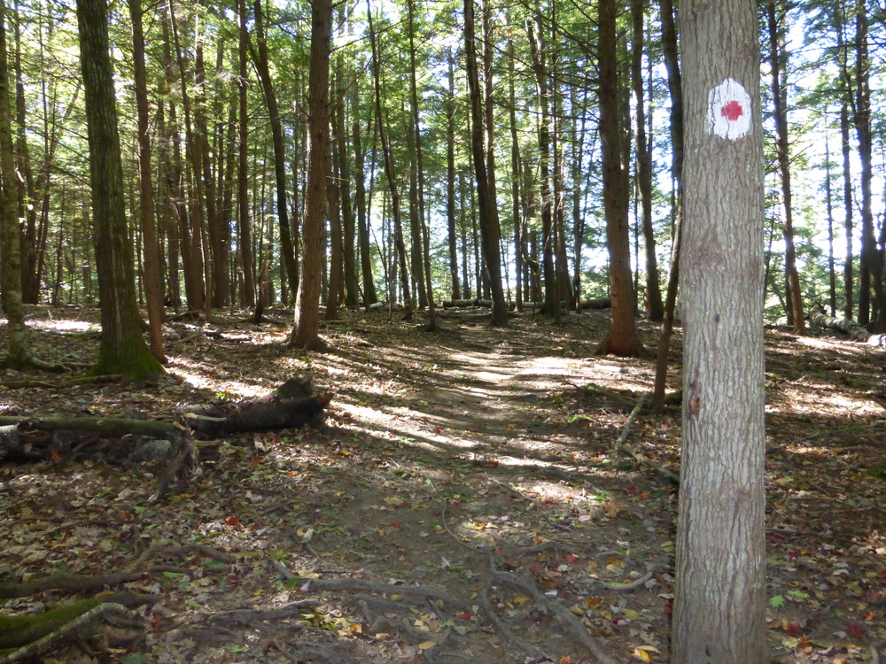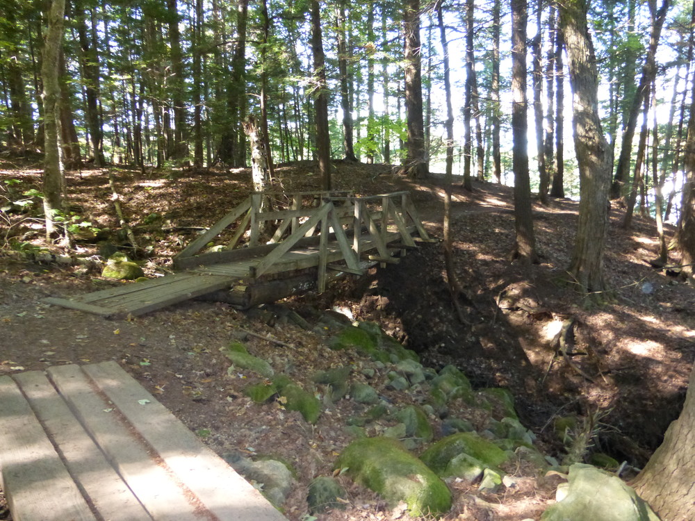 The path from here is mostly single track, crosses several footbridges and passes through beautiful hemlock woods to where the Stream broadens out into a lake. The path follows the edge of the lake, out around a peninsula, and then connects with the power line. It then heads east and north along the power line until the dam access road where it turns west (left). Wooden and then steel steps take you over the black wood and creosote penstock. The trail then continues along an access road to Rice Rips Road.
