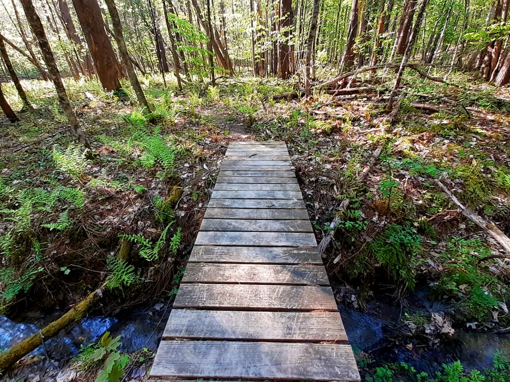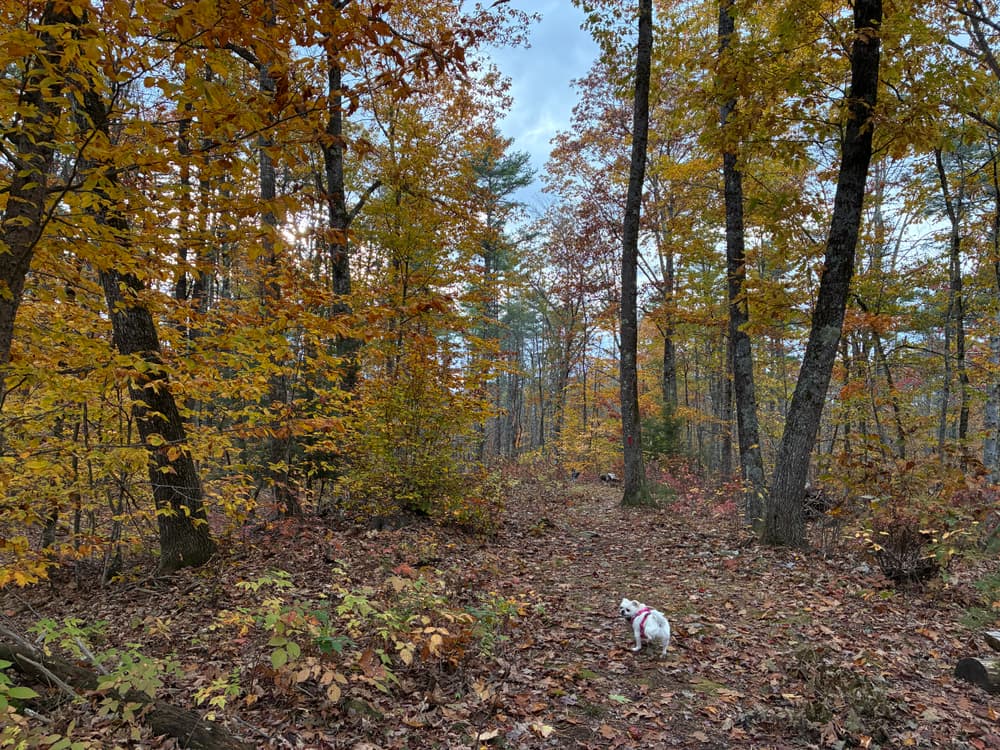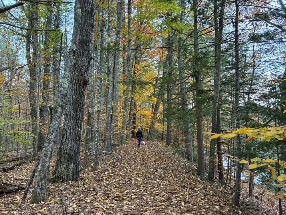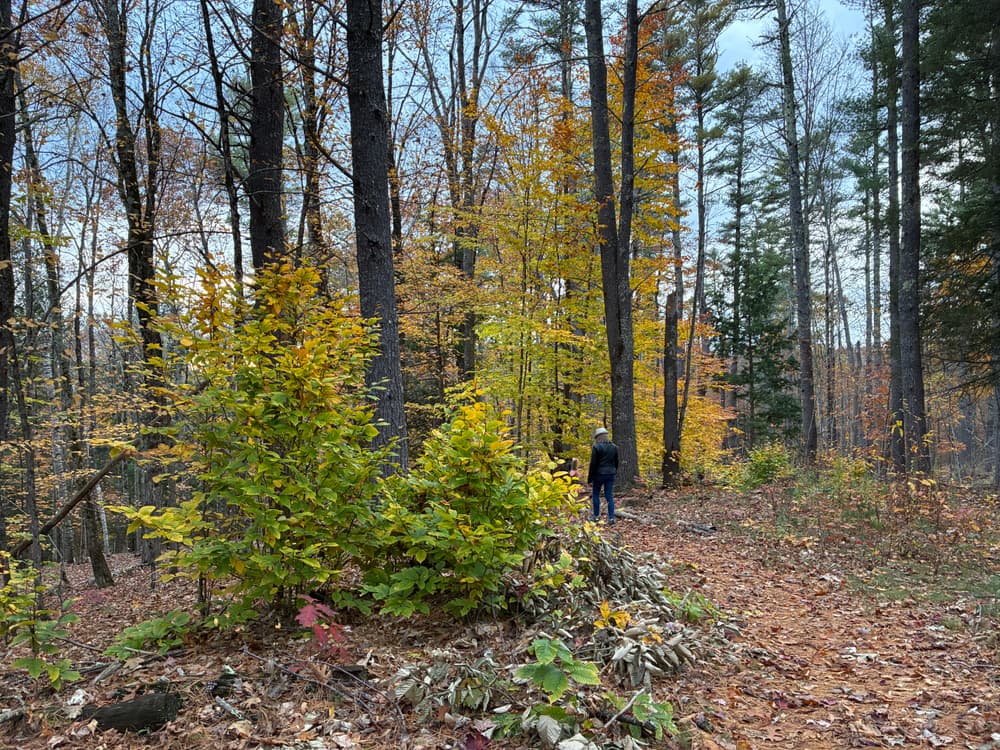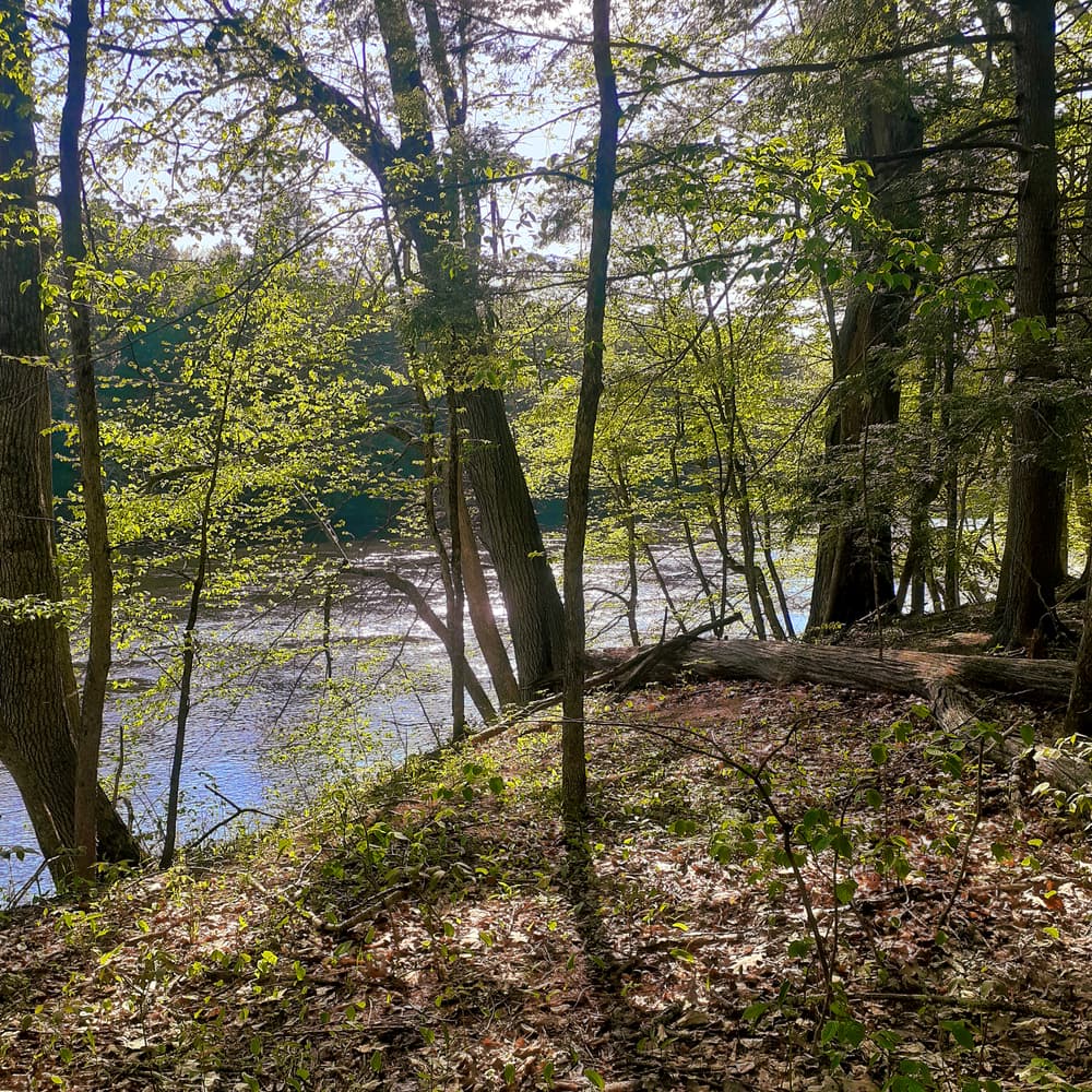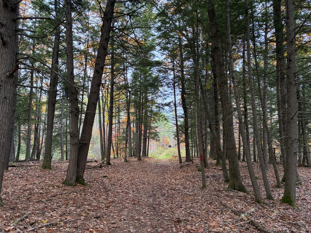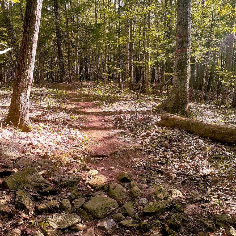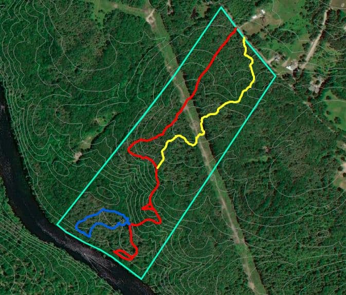 The main trail from the parking area to the river (red trail in image) is the recommended path when you visit this property. This trail is about 1.5 miles, out and back, and includes a poster describing the Saco River watershed at the riverbank. There are gentle hills with some narrow, seasonally wet, eroded sections. Unique tree species including shagback hickory, basswood, and hophornbeam exist along the trail side. Keep your eyes peeled for wild blueberries, strawberries, raspberries, and black berries!