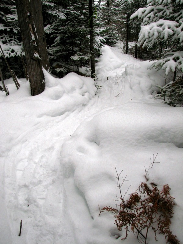 Those wishing for a shorter adventure and having access to two vehicles can follow the snowmobile trail downhill and to the left where it shortly meets up with Center Hill Road. At Center Hill Road, there is a small, plowed area where one can meet a car and drive back to the Center Hill Parking area. Those without an extra vehicle will need to backtrack to return to the trailhead and parking area.