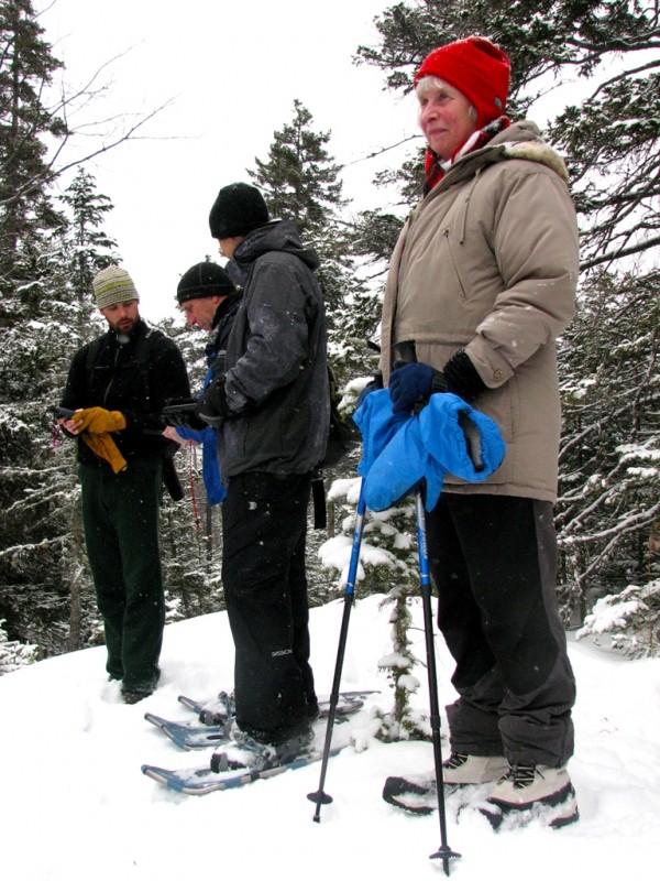 The Center Hill Snowshoe Trail is marked with pink survey tape and flagging, and while slightly more difficult than the Rock Lookout Trail, is still accessible to the novice. After a little more than a mile, the trail splits and a side trail on the right leads east to the ledges at Center Hill. From the ledges there are excellent views to the south, west, and north.