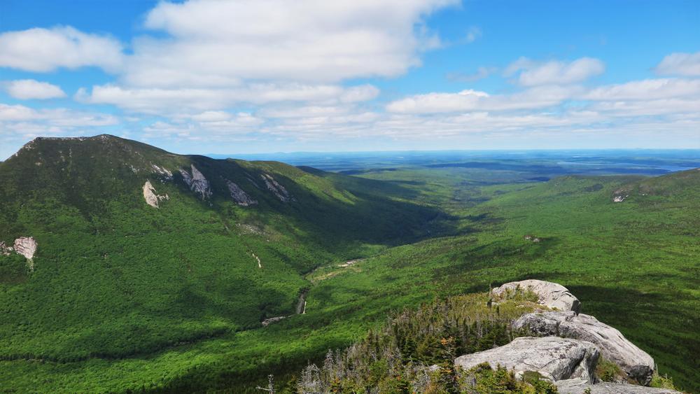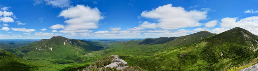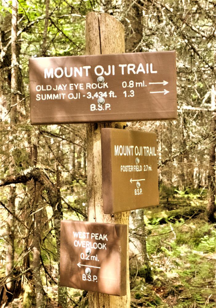Mount O-J-I lies across the Nesowadnehunk Valley from Doubletop Mountain, with an elevation of 3,410 feet. Its unusual name originated from three prominent slides on the southwest face that at one time formed the rough outline of the letters O-J-I. Since 1932, smaller slides have altered the shape of these letters.