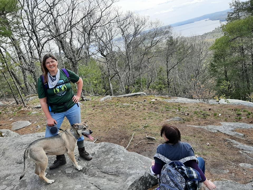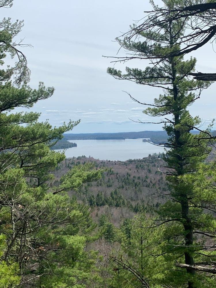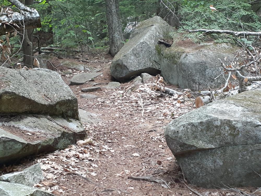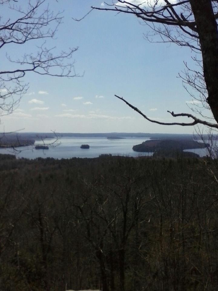 The trail, marked with blue blazes, leaves from the northeast corner of the parking lot heading east and in less than 0.1 miles splits. Bear right to follow the trail counterclockwise. The trail passes though a grove of tall mature pines then heads northwest up Mount Phillip’s eastern slope, gently climbing through a mixed forest of hardwoods and evergreens. It continues up to a rocky ledge on Mount Phillip’s eastern side at 0.6 miles and crosses the ledge westward to a rocky, partial summit clearing (755'). After enjoying views of Great Pond to the south and the Kennebec Highlands to the west, continue the loop trail by descending to the west, then turning in a southerly direction and dropping down into a stand of mature hemlock. Follow the trail back to the junction and the parking lot.