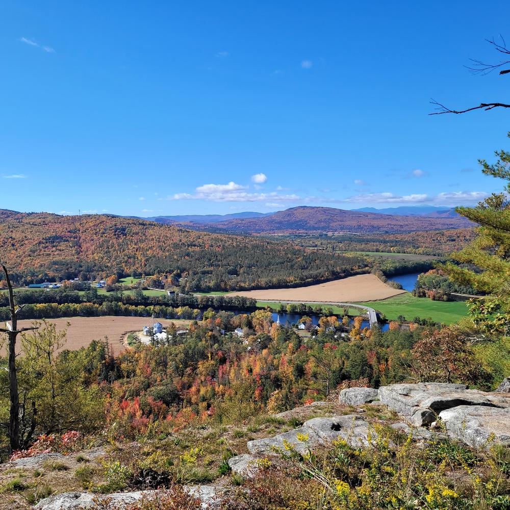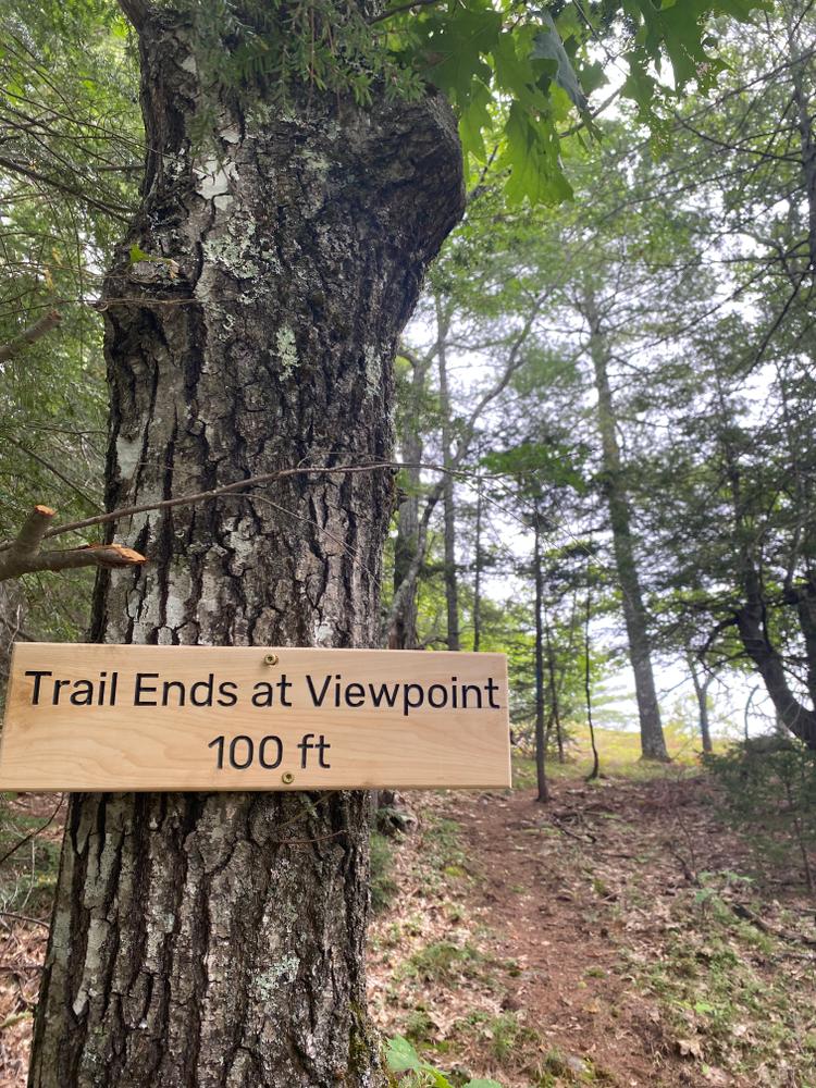 The Mystery Mountain Trail is a 1.5 mile out and back hiking trail that travels through the 67-acre Rumford Point Conservation Fund tract. From the parking area to the left of the driveway, the trail gradually gains elevation through a recently harvested forest stand for 0.3 miles before ascending via a switchbacks up a rocky hemlock-dotted ridge. The trail then traverses to two separate viewpoints overlooking Rumford Point, Sunday River Resort and the Presidential Range in White Mountains to the west. The trail ends at the second viewpoint, which is indicated by signage. It is marked with blue flagging tape and rock cairns.