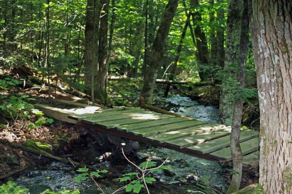 This is a snowshoe trail only. It links with Tom's Return to form the Pet Snowshoe loop. Follow yellow signs with black paw prints. The trail is not always visible after fresh snow. It descends from the Rock Gardens then skirts the edge to the pine tree plantation, and passes along the edge of the field next to the Gallagher Farm before climbing up an old logging road back to Tom's Return near the roadside trailhead. This is a very scenic trail with passes through old Apple tree orchards and maturing conifer forests.