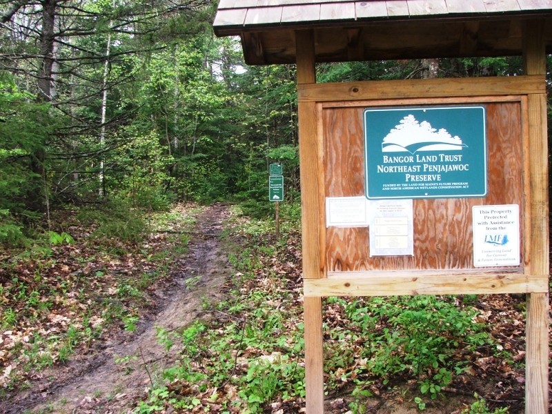 The trail enters into the forest next to the Bangor Land Trust kiosk and navigates through an upland forest with an abundance of red oak, red maple, and balsam fir. Shortly after the trailhead, the path forks. Both directions reconnect to form a loop near the upper Penjajawoc Stream that flows into Penjajawoc Marsh.