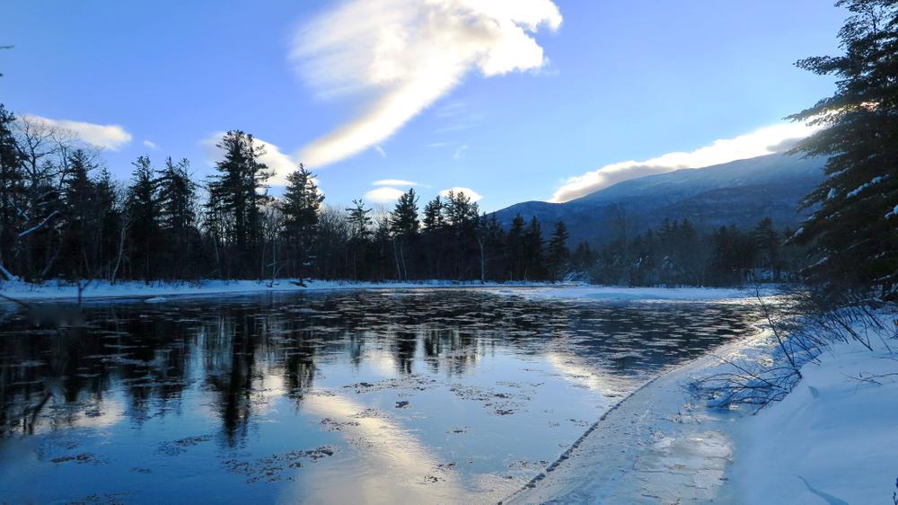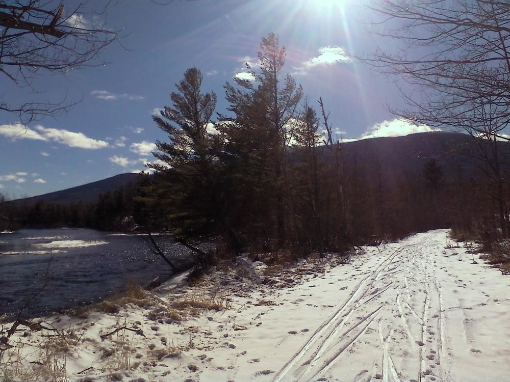 The Old River Road Winter Trail begins from a small parking area just off the Grand Lake Road. The groomed trail starts on a seasonal road that is closed during the winter. Follow this trail for 0.8 miles, past an info kiosk, to a junction where the loop begins. To do the loop in a clockwise direction, turn left at this junction. The trail gradually descends through hardwood forest, then makes a sharp turn and begins running alongside the East Branch Penobscot River. The trail follows the river for about 1.8 miles and then turns back up, making a very gradual ascent back up to the seasonally closed road. Turn right here (the trail to the left goes towards Haskell Rock Pitch) and you will eventually find yourself back at the start of the loop. From here you can decide to do the loop again, or head back to the trailhead by the same route you came in on.