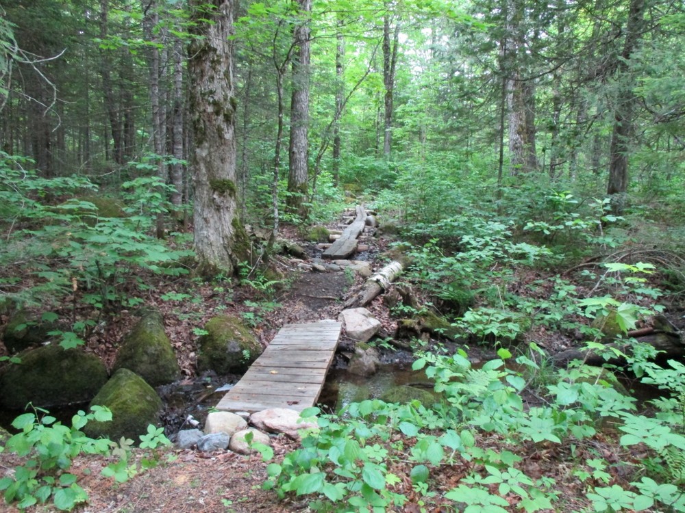 The Orin Falls Trail is a great hike for families and fishing enthusiasts looking to access Wassataquoik Stream. Most of the trail is former logging road, so it is wide and avoids steep slopes. A portion of the International Appalachian Trail also follows the same path for a short distance. The trail begins by following a ridge above Wassataquoik Stream before dropping to cross a bridge over Katahdin Brook (the outflow from Katahdin Lake inside Baxter State Park). Just beyond the bridge there is a large campsite as well as a lean-to shelter. Both have picnic tables and fire rings. This easily accessible campsite, less than a mile from the trailhead, is a perfect base camp for first-time backcountry campers exploring the area.
