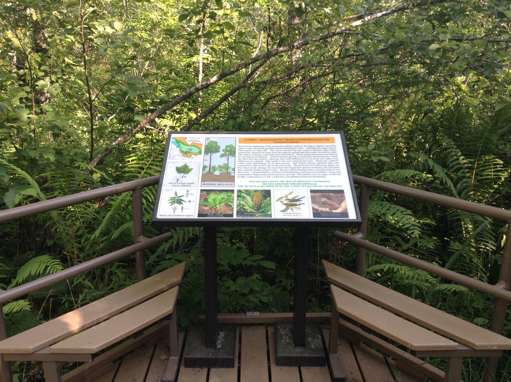 The Boardwalk has 7 octagonal, 10-foot wide interpretative stations that provide visitors with information highlighting the geology, plants, and animals in that particular area. Each station has 4 benches. Other benches, positioned every 200 feet, allow visitors to rest and reflect upon their journey through the bog. These benches are located on 2'x8' sections attached to a regular Boardwalk section and serve as wheelchair and stroller turnarounds.