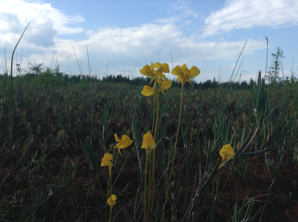 At section 100 (800 feet in) the Boardwalk splits and forms a loop, consisting of 409 sections (or 3200 feet). The first 186 sections (1500 feet) of the Boardwalk are dominated by woody vegetation and include a variety of fern species, black spruce, larch, sedges, skunk cabbage, leatherleaf, Labrador tea, bog bean, and other plants. The Boardwalk then travels through an open bog. Most of the trees and shrubs are less than 6 feet tall with a few conifers reaching heights of 20 feet. In some areas, the Boardwalk traverses peat that is over 25 feet deep. The vegetation in this area is dominated by a variety of peat species. Depending on the time of a visit the following plants may be observed blooming or fruiting: pitcher plant, bog rosemary, rhodora, sheep laurel, tawny cotton grass, two species of sundew, bog cranberry, and four species of orchid, including grass pink and white-fringed.