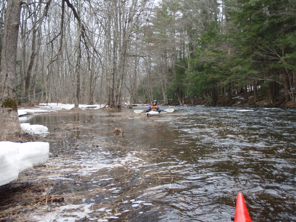 Flow information: There is no river gage on the Passagassawakeag, but the flow of the Ducktrap River, about 10 miles away, is a good indicator. Generally if the Ducktrap Gage is above 100 cfs, the level will be at least medium on the Passy. The Rolerson Bridge is a good place to gauge whether the water level is too low (Is there enough water to pass through the rocks just downstream of the bridge?) or too high (Is the river flooded well up onto the lawn on the left as you look downstream of the bridge?). Since this rapid typically offers the biggest waves on the river, it is also a good place to assess whether river conditions are within your skill level.