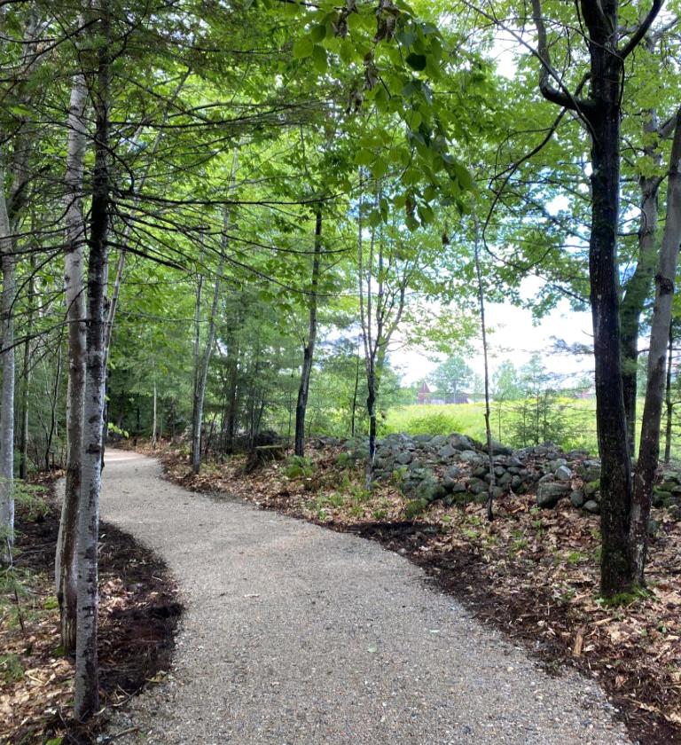 Peggy's Pasture Loop departs from the trailhead at the parking lot. This universal access trail loops a half mile at the edge of the woods around a field on a six-foot wide, gravel surface. There is a gentle slope up to the far end of the field and then back down. (Taking a right from the trailhead is recommened to do the loop counter-clockwise, to best enjoy the views!) Three benches spaced at equal intervals provide places to rest.