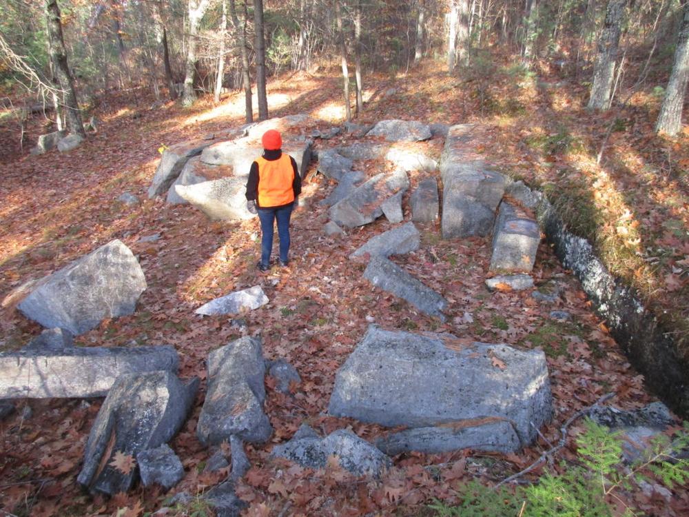 The Quarry Trail departs from the south end of Peggy's Pasture Loop; follow the blue blazes on the trail departing from Peggy's Pasture Loop at the top of the field. The trail is generally flat, although it is steep in some sections. There are roots and rocks on the trail near the quarries. From the trailhead out, around the loop, and back again makes for a total distance of about 1.7 miles.