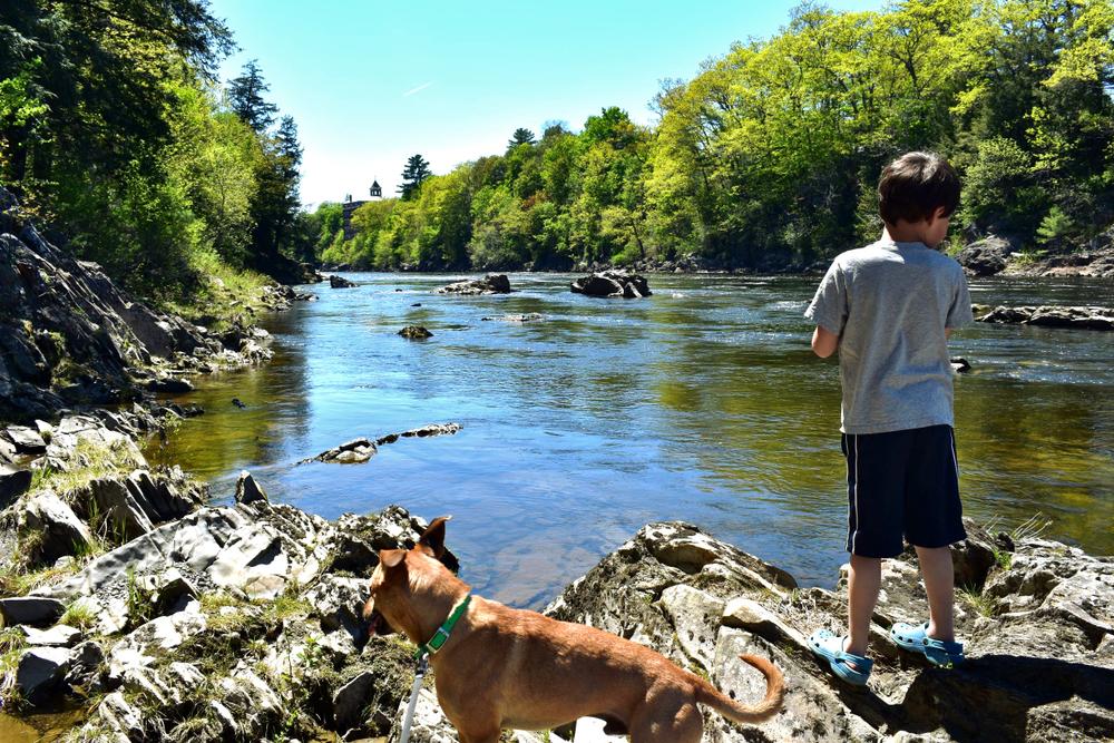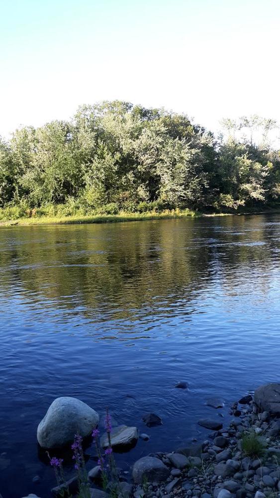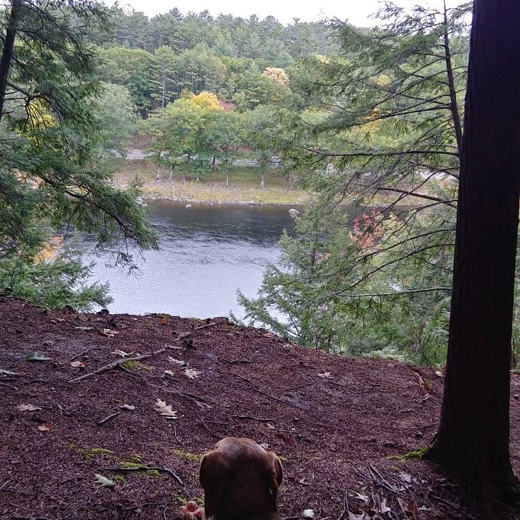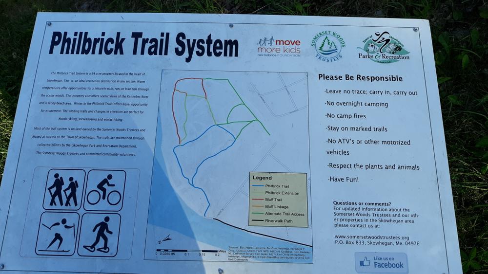 The blue-blazed Philbrick Trail begins near the perimeter of Skowhegan's water treatment plant, just across the road from the Debe Park River Walk trailhead. After following the fenceline of the treatment plant for approximately one-hundred yards, the trail breaks into the woods and over a small bridge into a hemlock forest. The trail splits once inside the woods and winds through the woods in a network of interconnected loops. These trails pass along the banks of the Kennebec and around and through several ravines that slope down toward the river. At low water, large stretches of the riverbanks are lined with sandy beaches and views of calm waters after they exit from the sharp gorge in Skowhegan's center.
