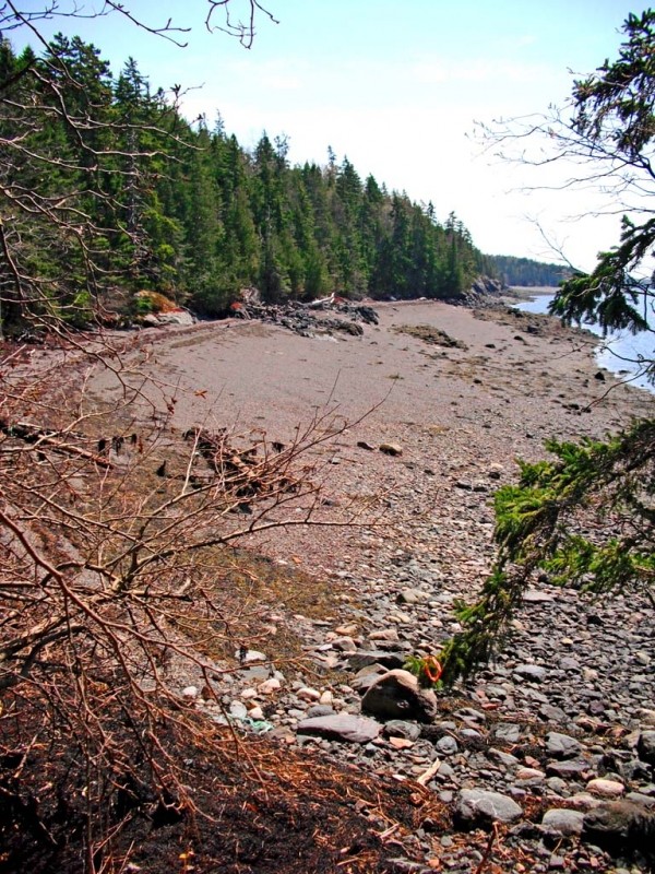 Cove Trail (0.5 miles round trip): This easy walk starts at the Downeast Adventures sign on the north side of the North Lubec Road. Walk down the lane to emerge at a small field with apple trees and an old barn, used by the Regional Medical Center at Lubec's Downeast Adventures outdoor education/community health program. Continue across the field, under the "zip line", to the woods on the far side. The trail slopes down gently through woods past two lean-tos that are used for Downeast Adventures overnights. At the shore, the trail hooks right to end at the stony beach midway along the tidal cove.