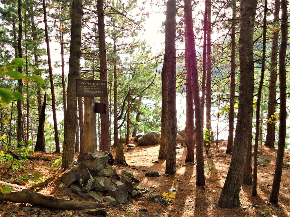 1.5 Miles: At the high point on the cliffs there is a trail junction with the Center Ridge Trail to the left, leading 5.8 miles to the summit of The Traveler, and connecting to the North Traveler Trail. Beyond the junction, the trail descends back to the shoreline of Upper South Branch Pond.