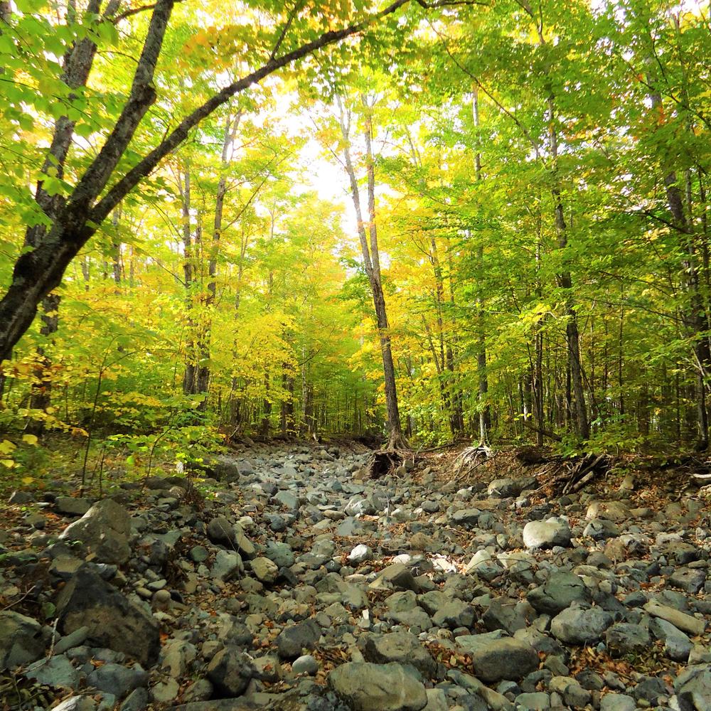 0.9 Miles: The trail emerges onto a wash (part of a true delta) of Howe Brook. To the right (west) is a canoe landing. The trail bears away from pond and soon parallels Howe Brook.