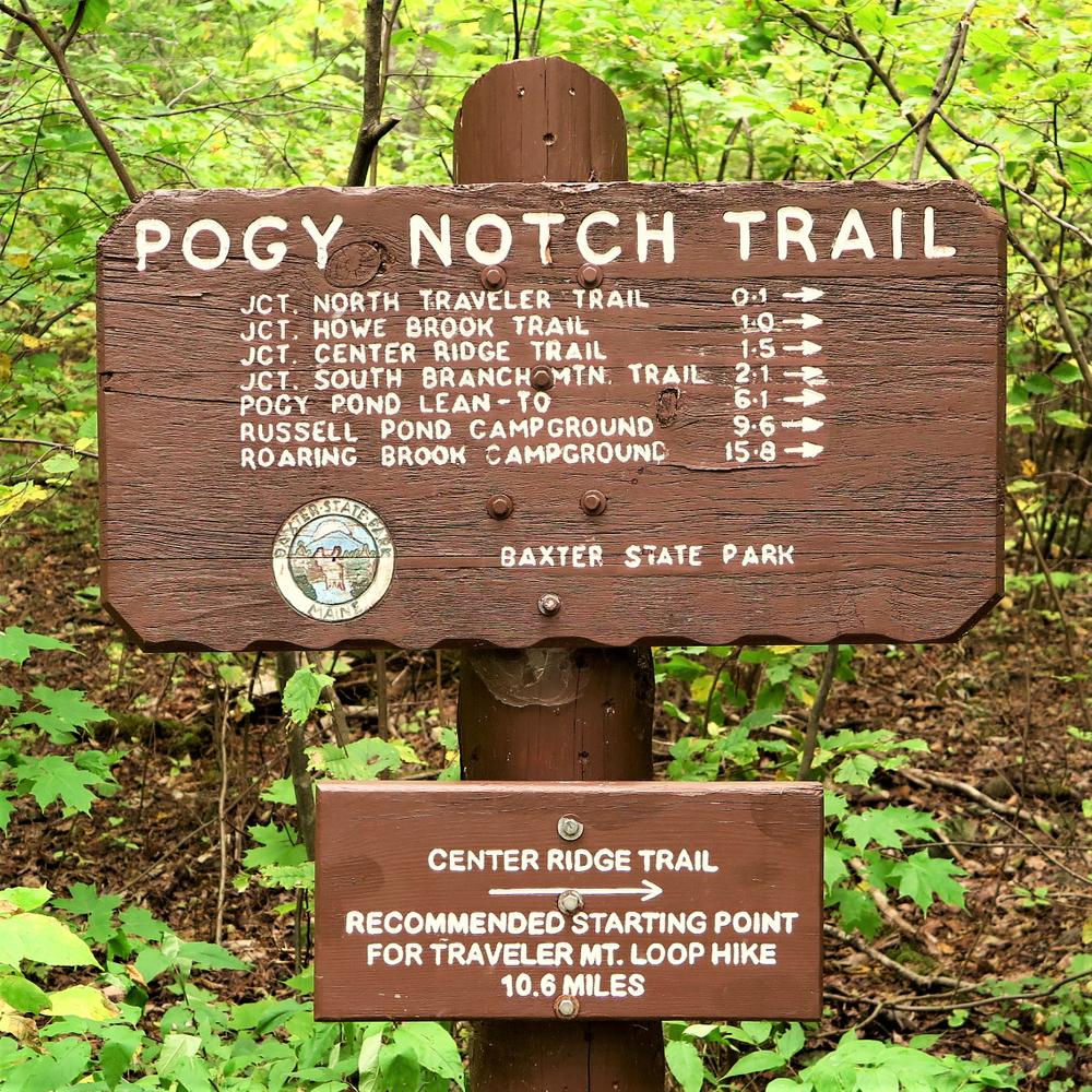 6.1 Miles: A trail junction at the northern end of Pogy Pond, with a side trail to the left (east) leading 0.2 miles around northern and eastern shores of pond to the Pogy Pond Lean-to. The Pogy Notch Trail continues straight head, skirting the west side of the pond.