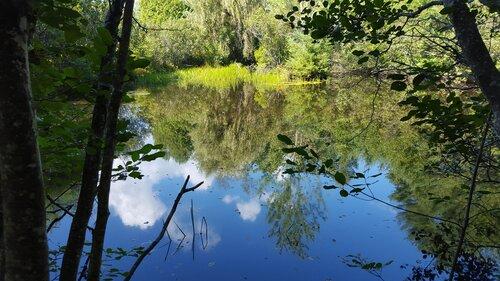 The trail runs through young forest and some wetlands and passes by two small ponds. The only moderately difficult part of the trail is the hilly northern leg of the blue trail, the top of which is almost the highest point of elevation in Westbrook. The rest of the trail is quite flat and easy, though some sections are narrow with uneven terrain. Due to the large size of this forest, there are excellent opportunities to view wildlife throughout the Preserve. Though close to Portland and ME-302, the only noise you will hear throughout much of the trail is running water and wildlife.