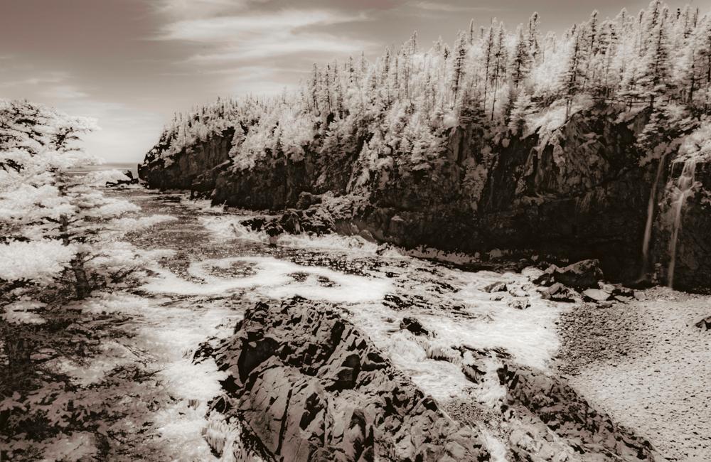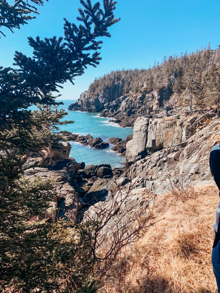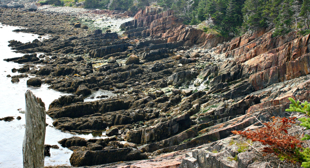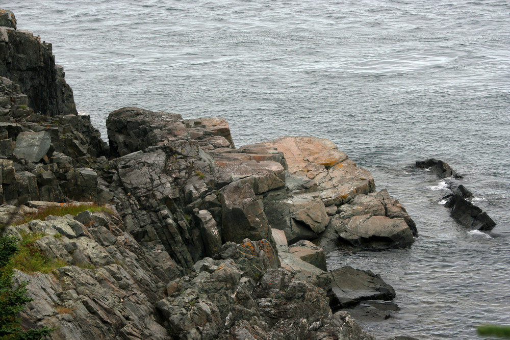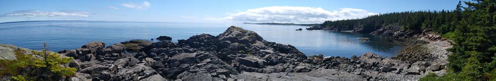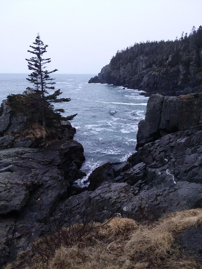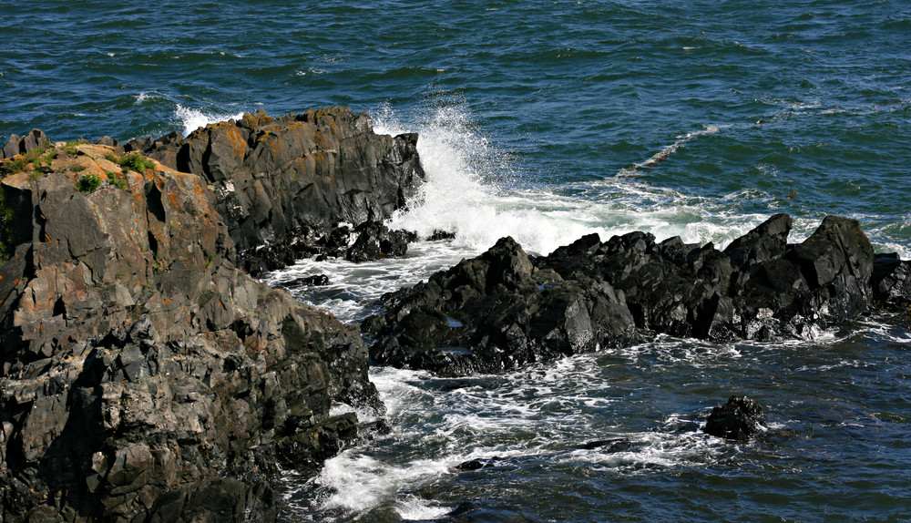 Coastal Trail (1.3 miles, moderate): The Coastal Trail (4-mile round-trip from the trailhead) affords more challenging terrain (and spectacular ocean views), with some steep rocky sections. The trail passes Gulliver’s Hole (a narrow chasm formed from the erosion of a vertical fault in the volcanic gabbro rock); High Ledge (a 150-foot bluff); and Green Point, a ledge outcropping where hikers can witness the surging tides and pounding surf. The trail looks over Quoddy Channel to the towering red cliffs of Grand Manan Island in New Brunswick Canada.
