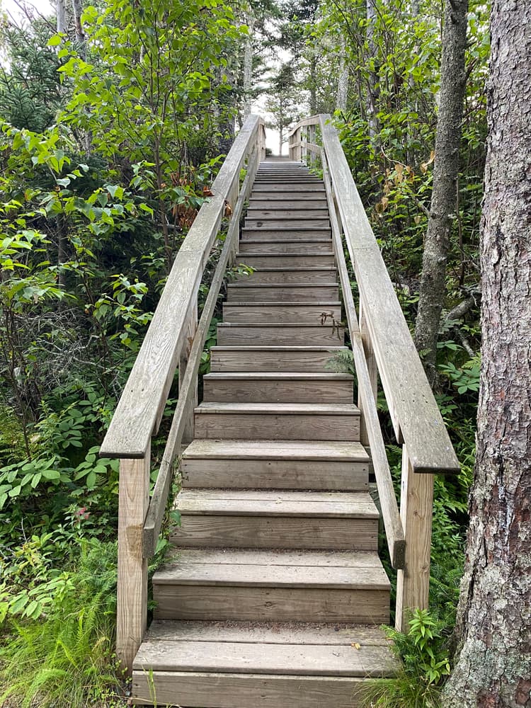 Bog Trail (0.2 miles, easy): The Bog Trail (1 mile round-trip from trailhead), off the Inland Trail, has raised boardwalk and interpretive signs describing the adaptation of how the plants thrive in high levels of acidic water and few nutrients. Please stay on raised boardwalk to prevent damaging the fragile bog plants. This trail goes through a heath with sub-arctic and arctic plants rarely seen south of Canada.