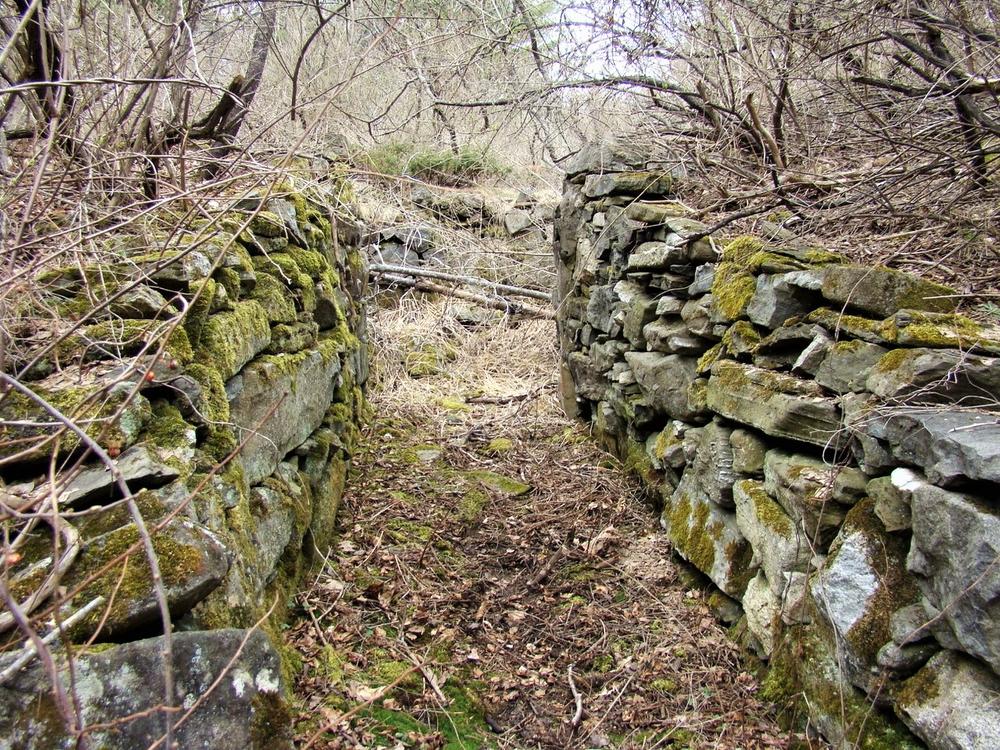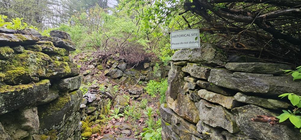 Upon crossing the road, the trail travels along an old logging road with dense young spruce, a section resembling the forest in Narnia as Lucy passes through the wardrobe. The trail crosses a small footbridge then heads toward a ridge, eventually trending to the left (south-southwest). The trail climbs the hill, utlizing impressive stonework built by the Maine Conservation Corps.