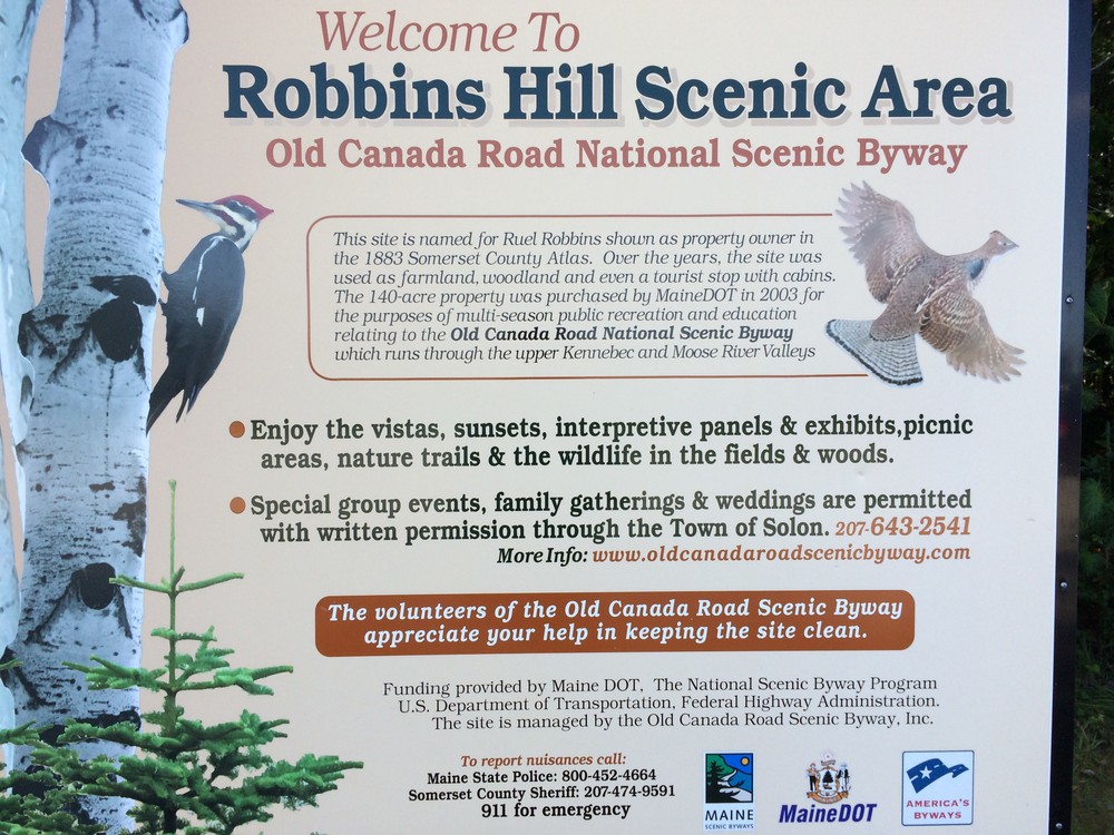 Old Canada Road Scenic BywayFrom Skowhegan: Travel north on US-201 for 10.3 miles. The access drive for Robbins Hill Scenic Area is on the left, 0.5 miles past the junction with ME-43.