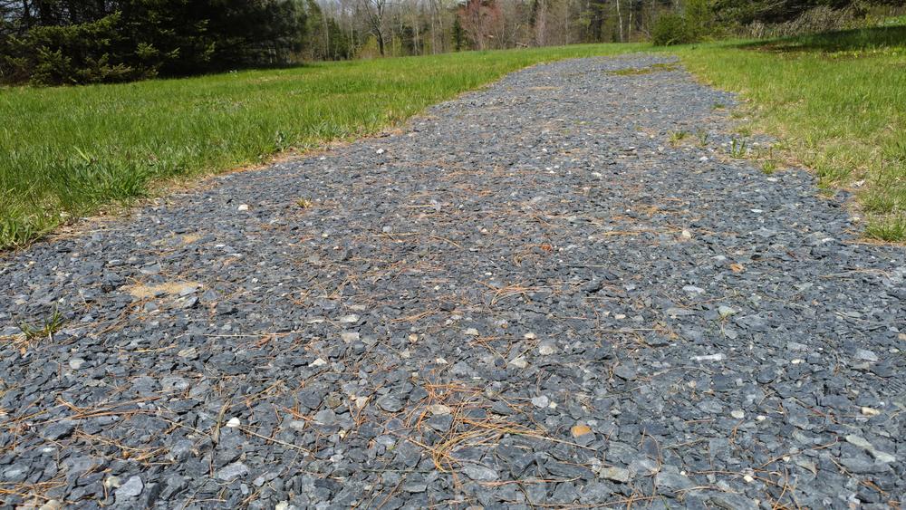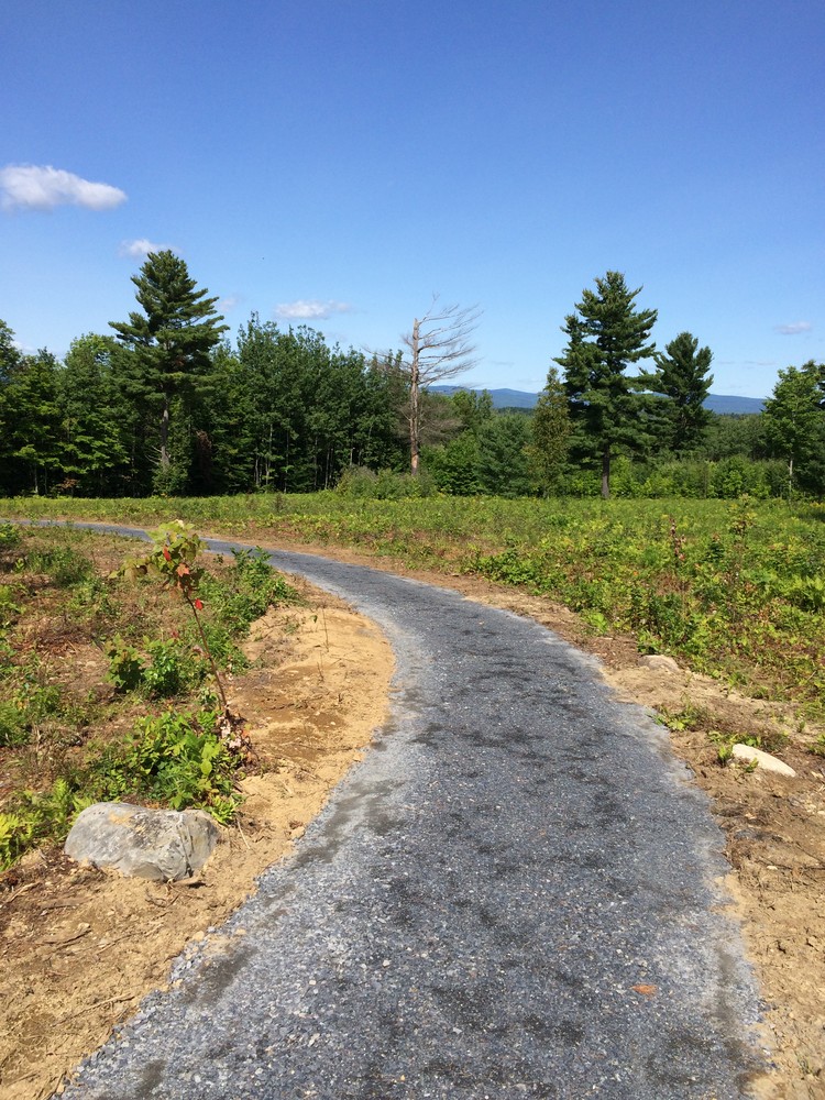 Upper Field and Lower Field Loops: Two loops form a figure eight at the center of the property. These trails are surfaced with large gravel, which is difficult to navigate with mobility assistance equipment on areas with steeper grades. The trails were originally designed as universally accessible, but they have deteriorated with time. Depending on the time of year, they may be a bit soft for some mobility devices. Accessing these also requires crossing grass. Benches and picnic tables have been placed at intervals along the trails, providing excellent places to rest and take in the views of Sugarloaf, Abraham, and the Bigelow Mountains to the west. Be sure to check out the interpretive panel at the southern end of the Lower Field Loop and keep your eyes out for the residents of this field habitat: wildflowers, blueberries, pollinators and soaring hawks.