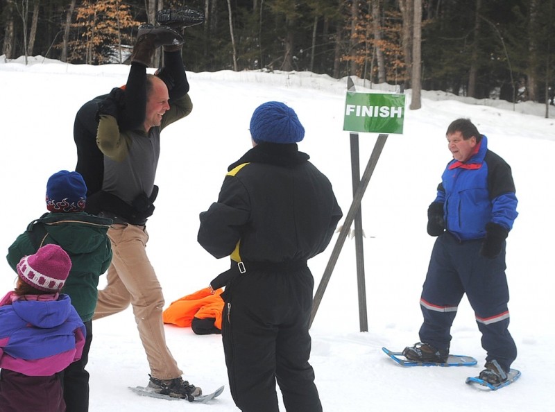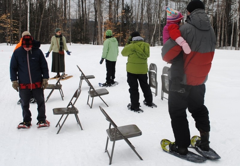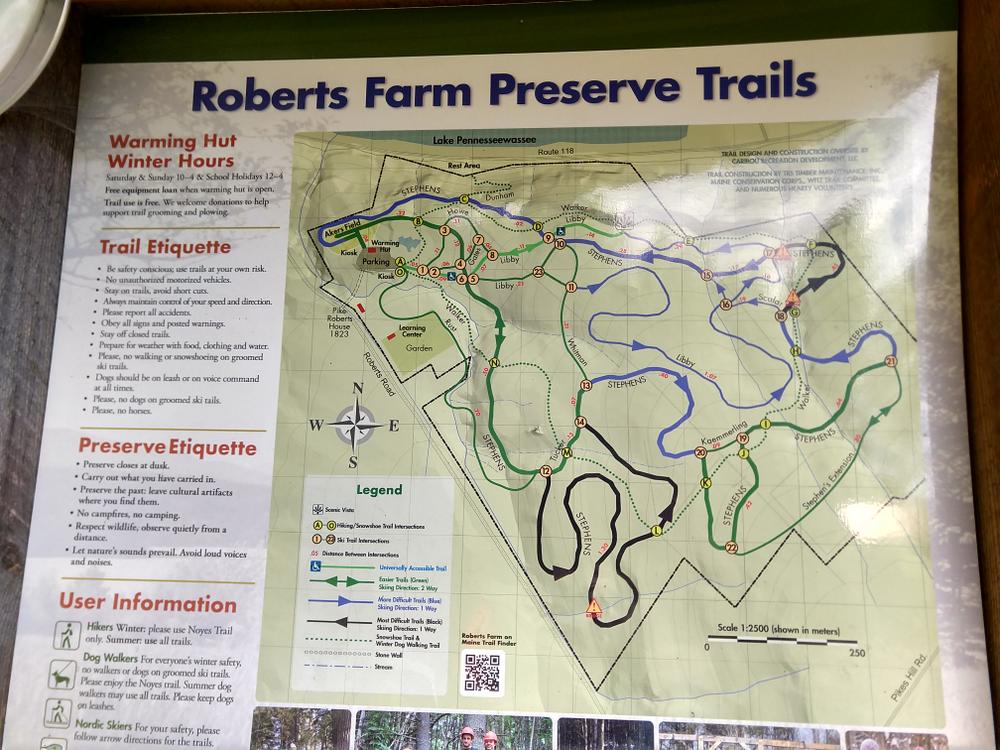 The hiking trail has two access points: at the Roberts Farm parking lot and at the rest area across from Lake Pennesseewassee on ME-117/118. The 2-kilometer trail from the rest area climbs to the wider ski trail and follows it to the scenic point where it continues to weave around and through the trail system to the parking lot at Roberts Farm. The hiking trail is a primitive footpath that is also enjoyable for snowshoers in the winter months.