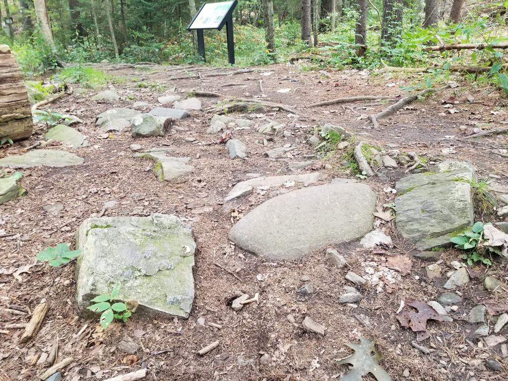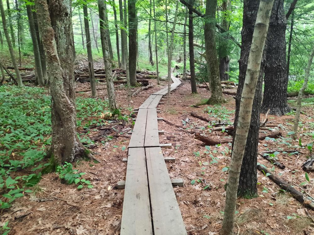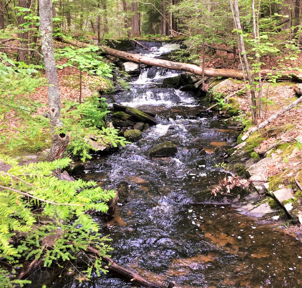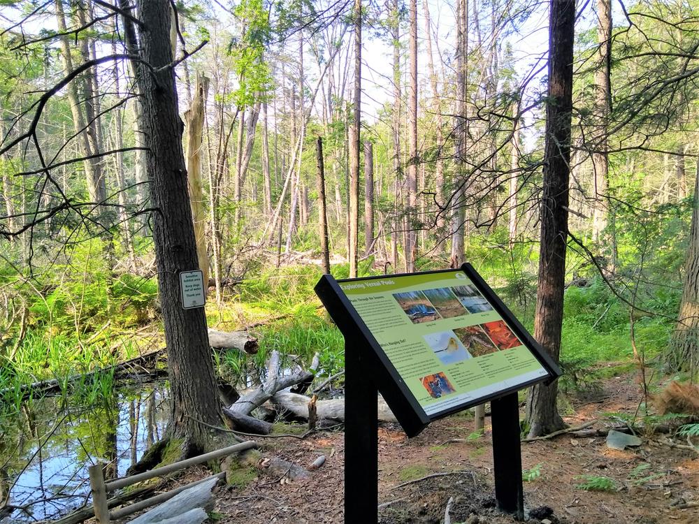 Due to its rocky, uneven terrain, much of the Robinson Woods Preserve was not suitable for farming and remained in its natural forested state for hundreds of years. The trails pass through massive white pine, red oak, and hemlock trees, some as many as 300 years old. Perennial streams and vernal pools meander through the forest floor where abundant wildflower and fern groves flourish. Deeper into the woods, the trails explore 12 acres of fields, 5 acres of ponds, and over 20 acres of significant wetland habitat for wading birds and inland waterfowl, providing pleasant walking and excellent wildlife viewing opportunities. The trails north of the parking area are rocky and rooty, while the trail to the pond is smoother with fewer tripping hazards. Past the pond, there are more roots.